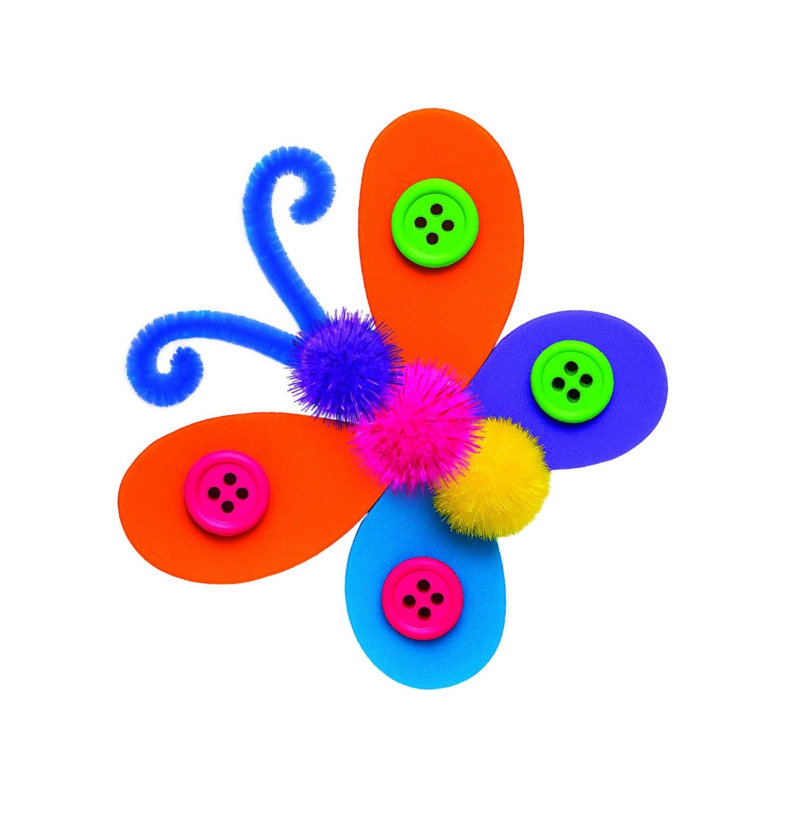 Combina alas de espuma, botones, pompones y limpiapipas para crear mariposas únicas. Perfecto para practicar la motricidad fina y las combinaciones de colores.