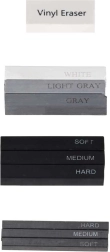 - 3× blanco (blanco, gris claro, gris oscuro), 3× negro (blando, medio, duro)