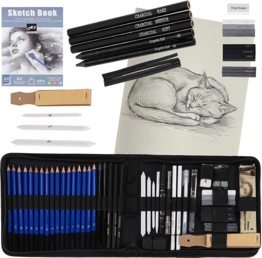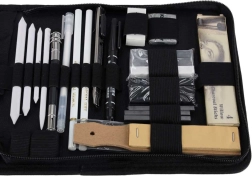 Este completo set de boceto es ideal para principiantes y avanzados. Incluye lápices de grafito de 12B a 5H, carbón en lápiz negro y blanco, barritas para trazos amplios y difuminos de papel para transiciones de tono fluidas. Todo está ordenado de forma clara en un estuche de nailon resistente que mantiene el equipo seguro en su lugar.