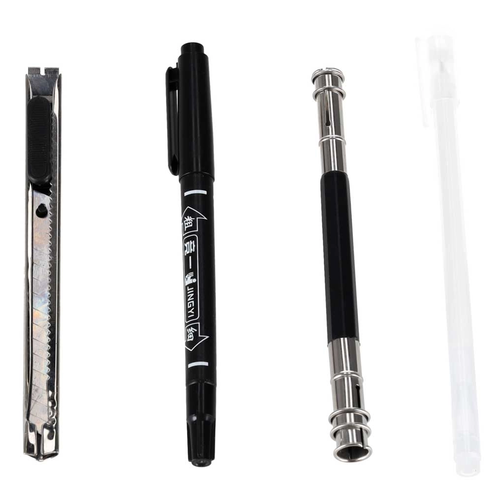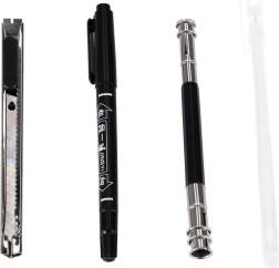 - rotulador de gel blanco, rotulador negro, alargador de lápices, cúter para papel, tablilla abrasiva, regla