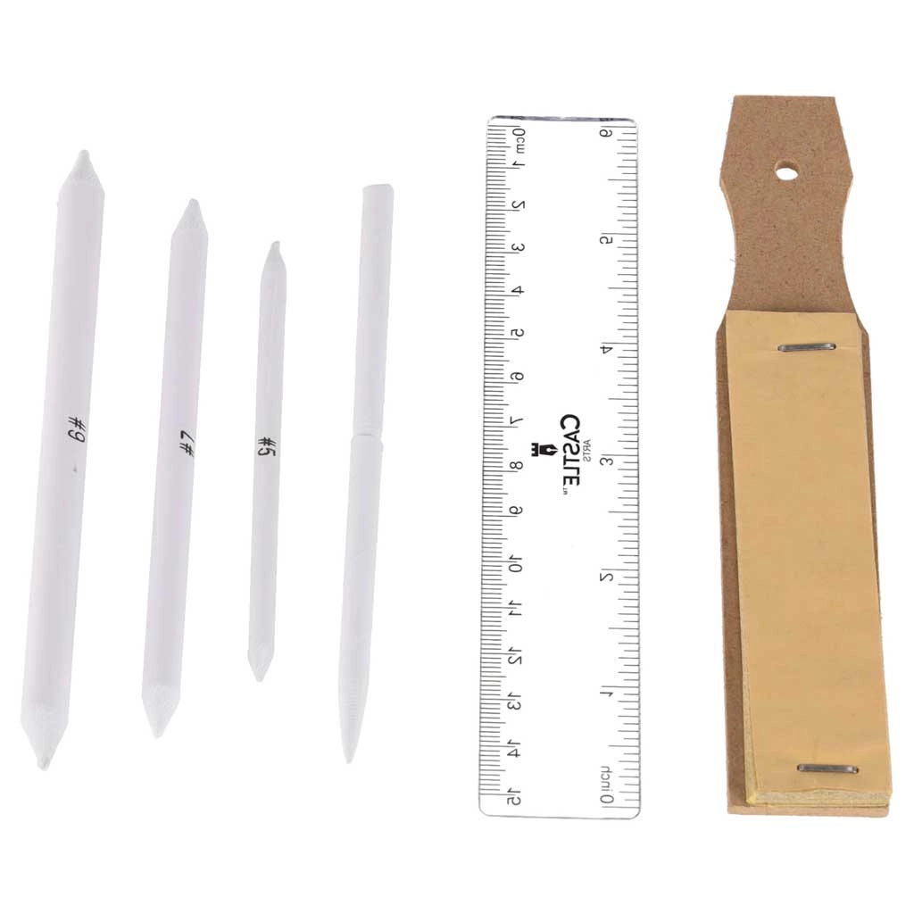 Difuminos de papel de varios tamaños, tablilla abrasiva y regla para transiciones limpias, detalles y líneas precisas.