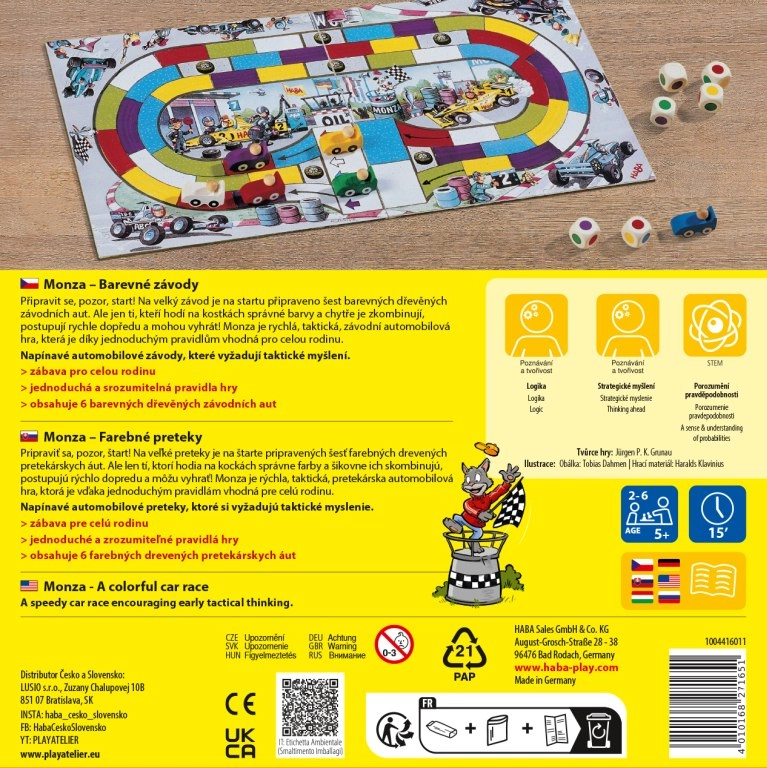 El divertido juego familiar Monza de la marca Haba ofrece carreras rápidas llenas de táctica y suerte. Gracias a sus reglas sencillas, es ideal para niños y adultos, se juega con 2–6 jugadores y cada partida dura solo unos 15 minutos.