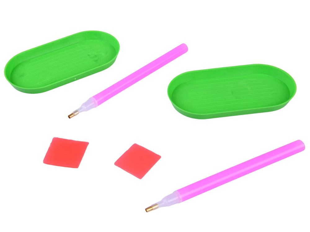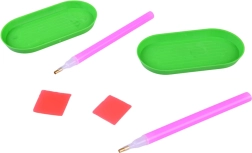 Dos bandejas con ranuras, dos lápices aplicadores y dos ceras garantizan una colocación precisa y cómoda de las piedritas, ideal para niños y principiantes.