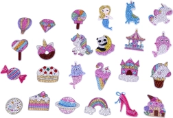 - 24 colgantes de plástico para decorar con piedritas, 12 cadenas metálicas, 12 ganchos/clips de plástico, 2 bandejas para piedritas, 2 ceras, 2 lápices aplicadores, >3000 piedritas