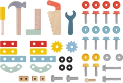 Gracias a las bandas de goma en las ruedas, el desplazamiento es silencioso y cuidadoso con el suelo. El mango ergonómico se adapta a la mano infantil y la caja trasera para herramientas guarda todas las piezas. Incluye un completo conjunto de herramientas de madera y material de fijación para infinitas construcciones.