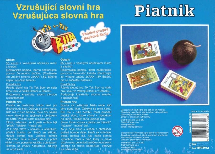 El juego es ideal para familias y grupos de idiomas: las cartas están en checo, eslovaco, inglés y alemán. La bomba electrónica se activa con el botón rojo y crea un ambiente emocionante en cada partida.