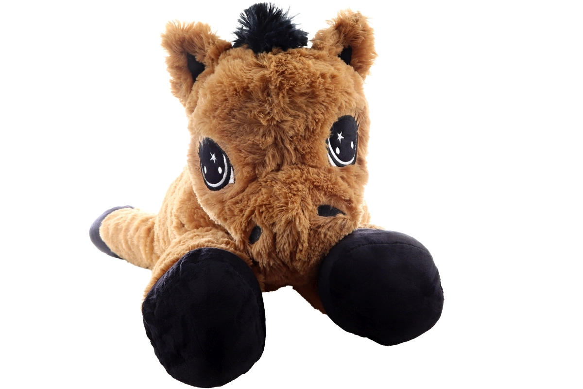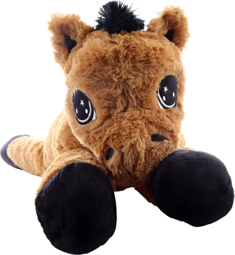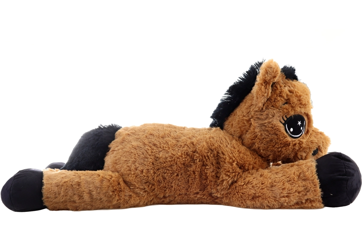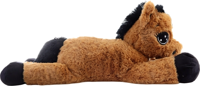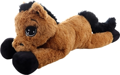 Este caballo de peluche marrón en posición tumbada encanta al primer contacto. Tiene grandes ojos bordados, crin y cola suaves, y funciona como un compañero abrazable y un apoyo cómodo para leer o ver cuentos. Las dimensiones de 80 × 32 × 25 cm garantizan espacio suficiente para abrazar y descansar.