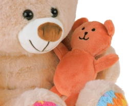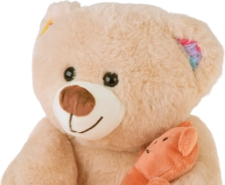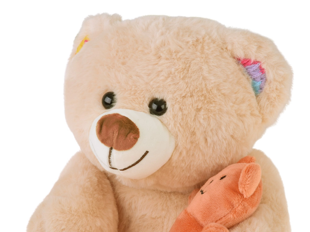 - Osito beige con detalles de color en patas y orejas, incluye mini osito naranja