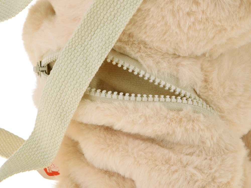 Esta suave mochila con forma de osito beige combina juguete y accesorio práctico en uno. Los detalles de color en patas y orejas, la sonrisa bordada y la superficie esponjosa y acogedora estimulan la imaginación infantil y el confort al llevarla. El bolsillo con cremallera oculto guarda pequeños tesoros, la merienda o pañuelos.