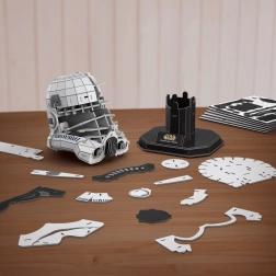 Este modelo 3D del casco de Stormtrooper, diseñado con precisión, encantará a cualquier fan de Star Wars. El set incluye 121 piezas precortadas en 6 láminas, que se extraen fácilmente y se montan siguiendo un manual claro. El resultado es un modelo compacto de 12 × 12 × 16 cm con soporte y placa para una exposición impactante.