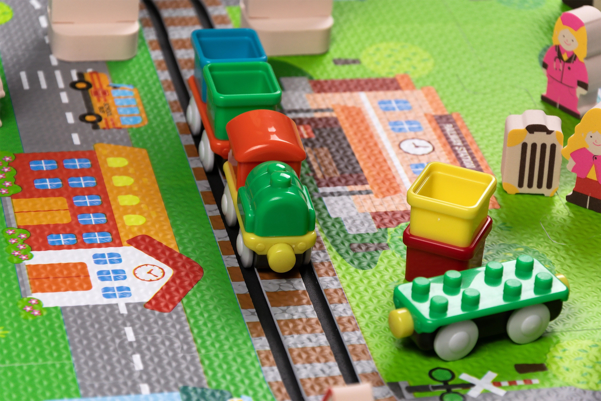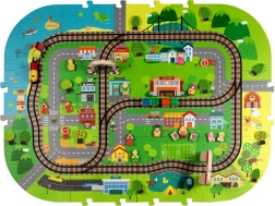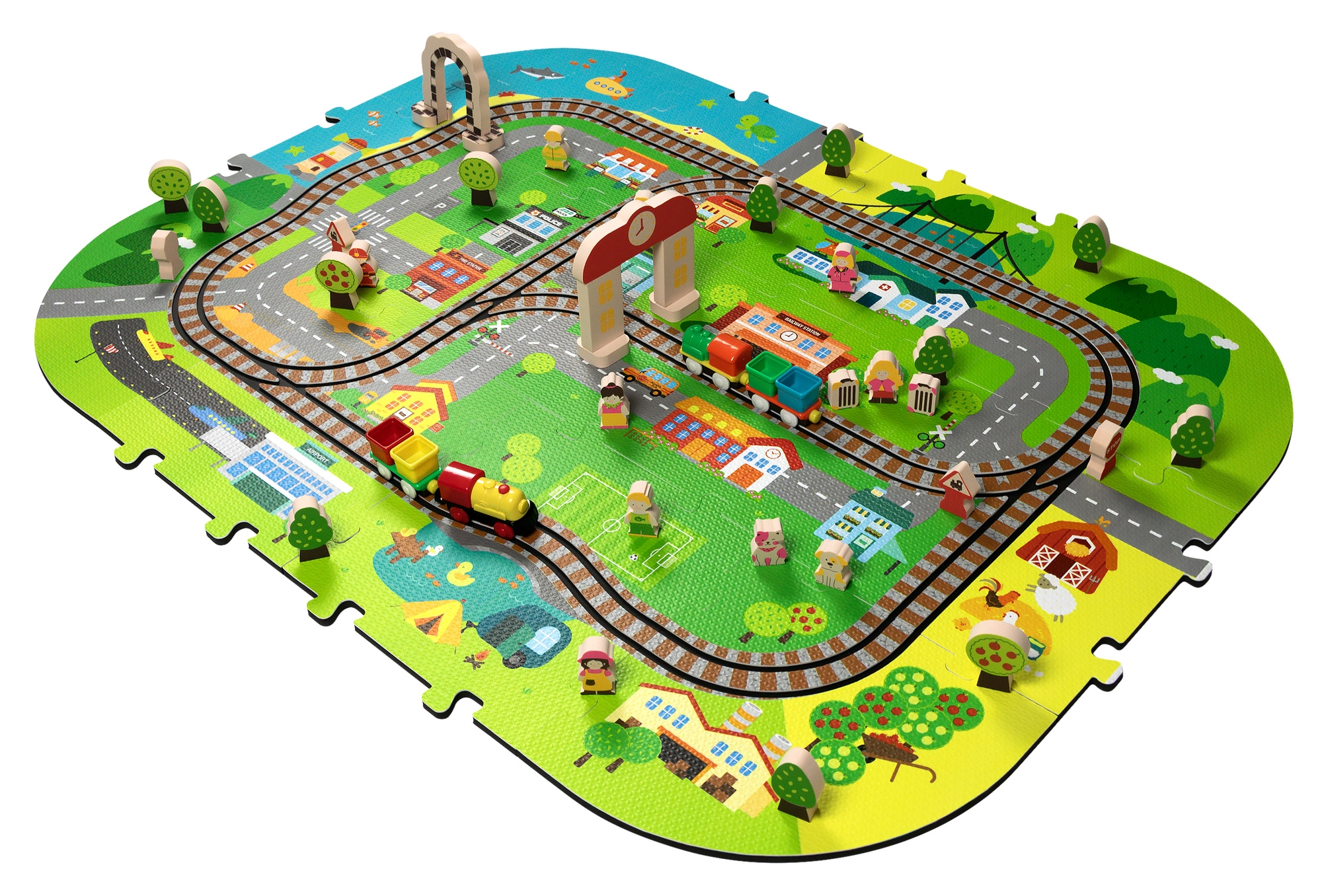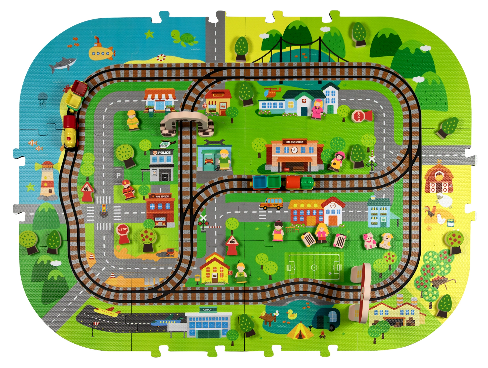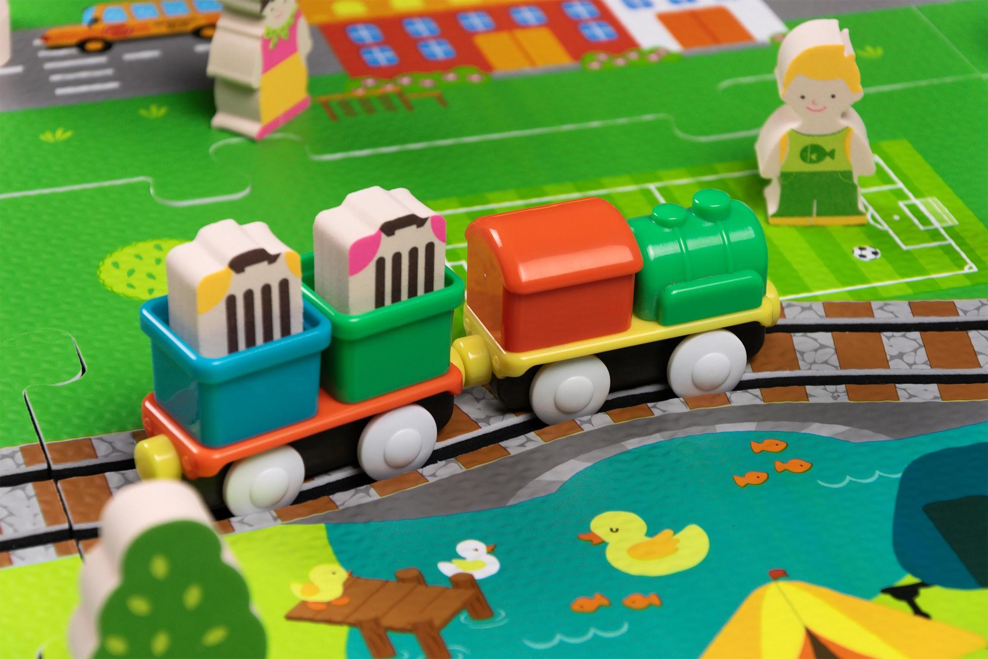 - Diversión 3 en 1: alfombra, puzle 3D de ciudad y tren en movimiento.