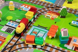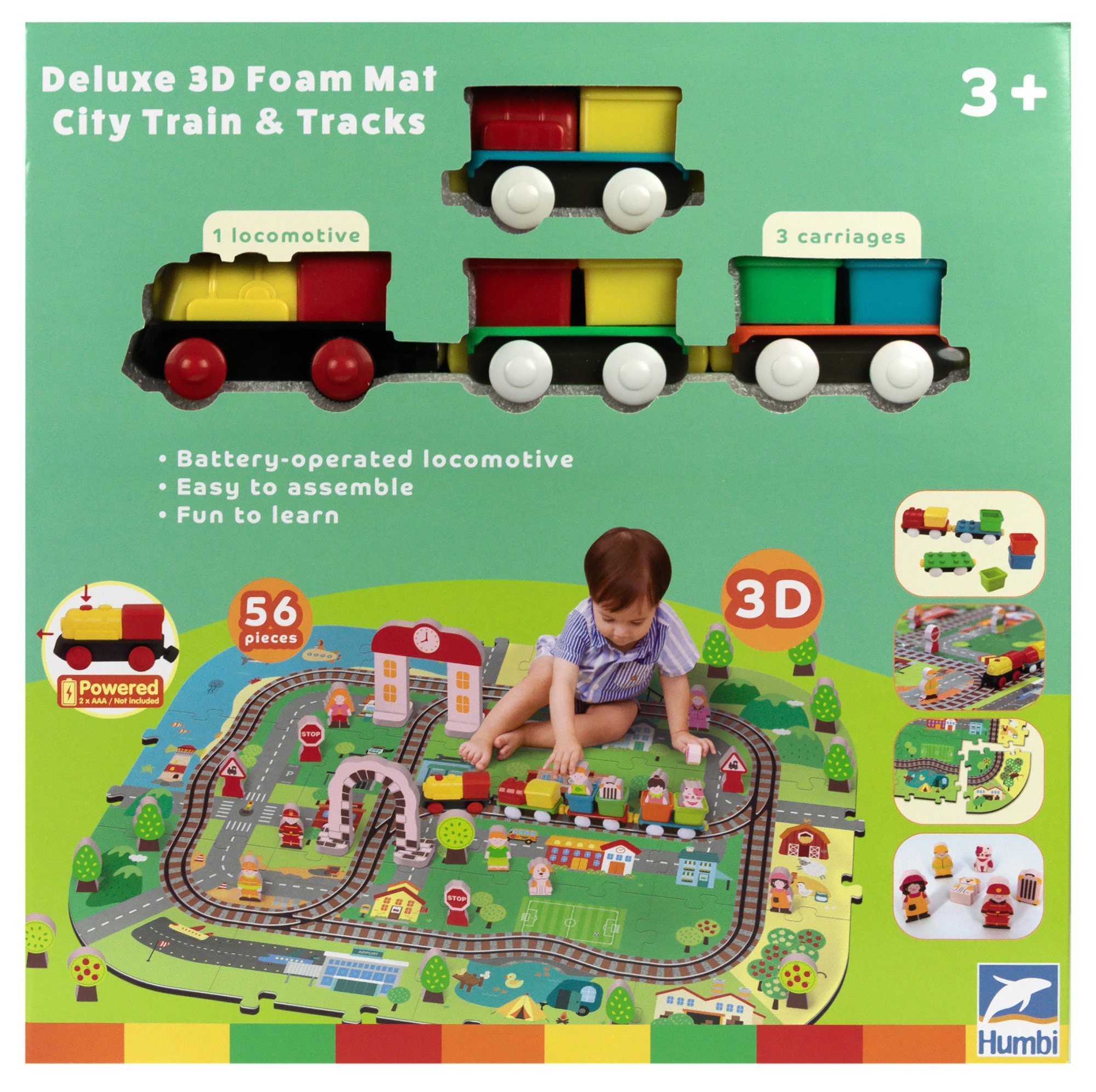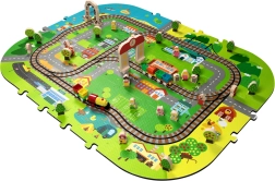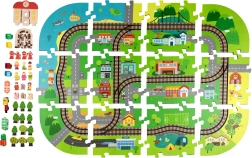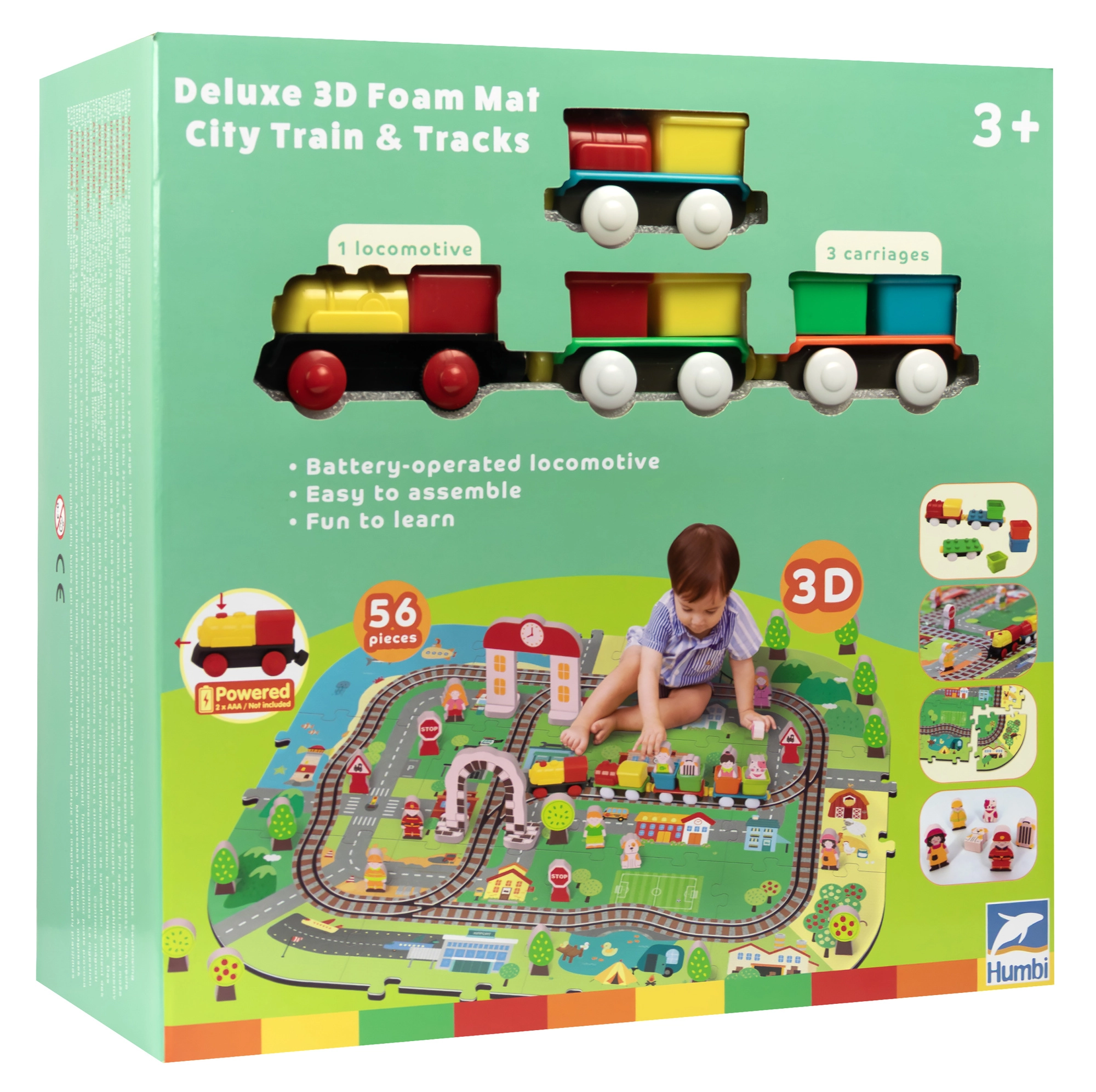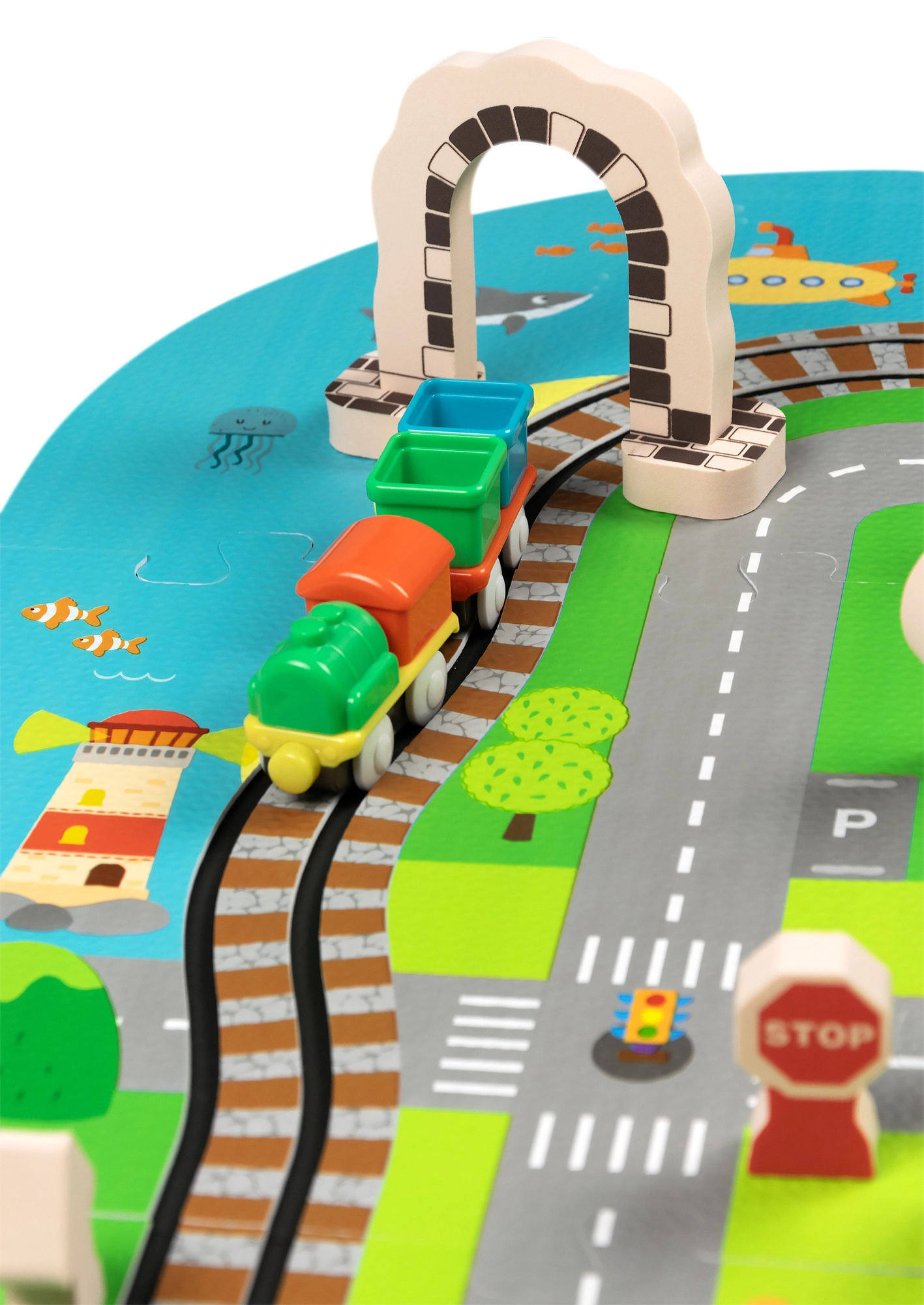 - Diversión 3 en 1: alfombra, puzle 3D de ciudad y tren en movimiento.