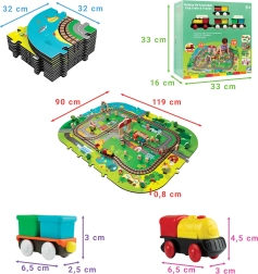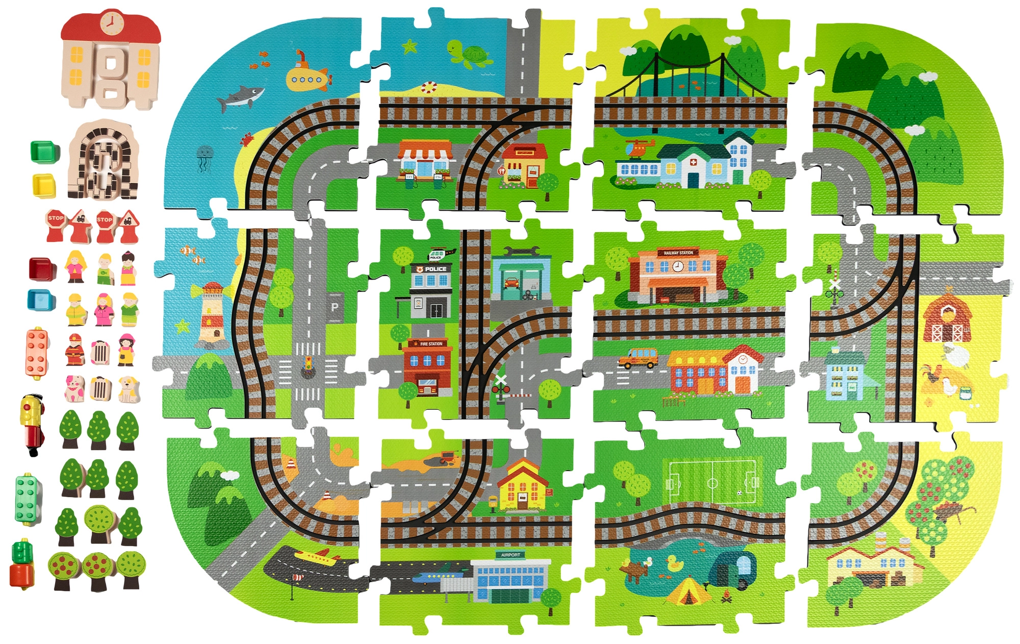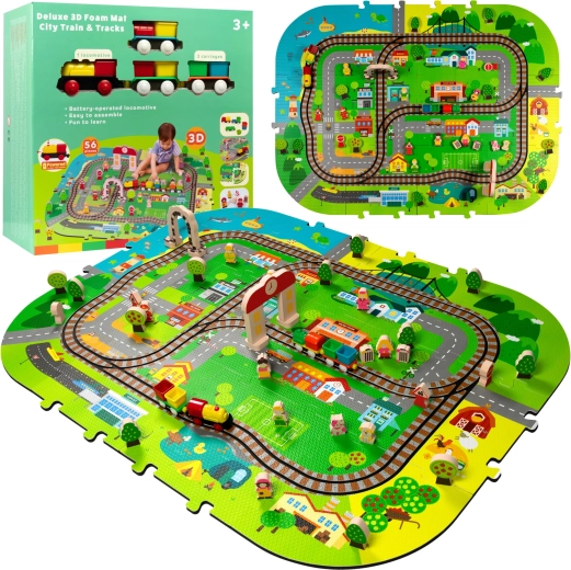 Descubre un divertido set 3 en 1 para niños: alfombra suave de EVA, ciudad 3D construible y tren automático a pilas. El conjunto incluye 56 piezas, entre ellas puzles de espuma con vías, locomotora y 3 vagones y 34 accesorios. Gracias a la espuma EVA segura, el acabado antideslizante y el equipamiento completo, fomenta la creatividad, el pensamiento lógico y la motricidad fina.