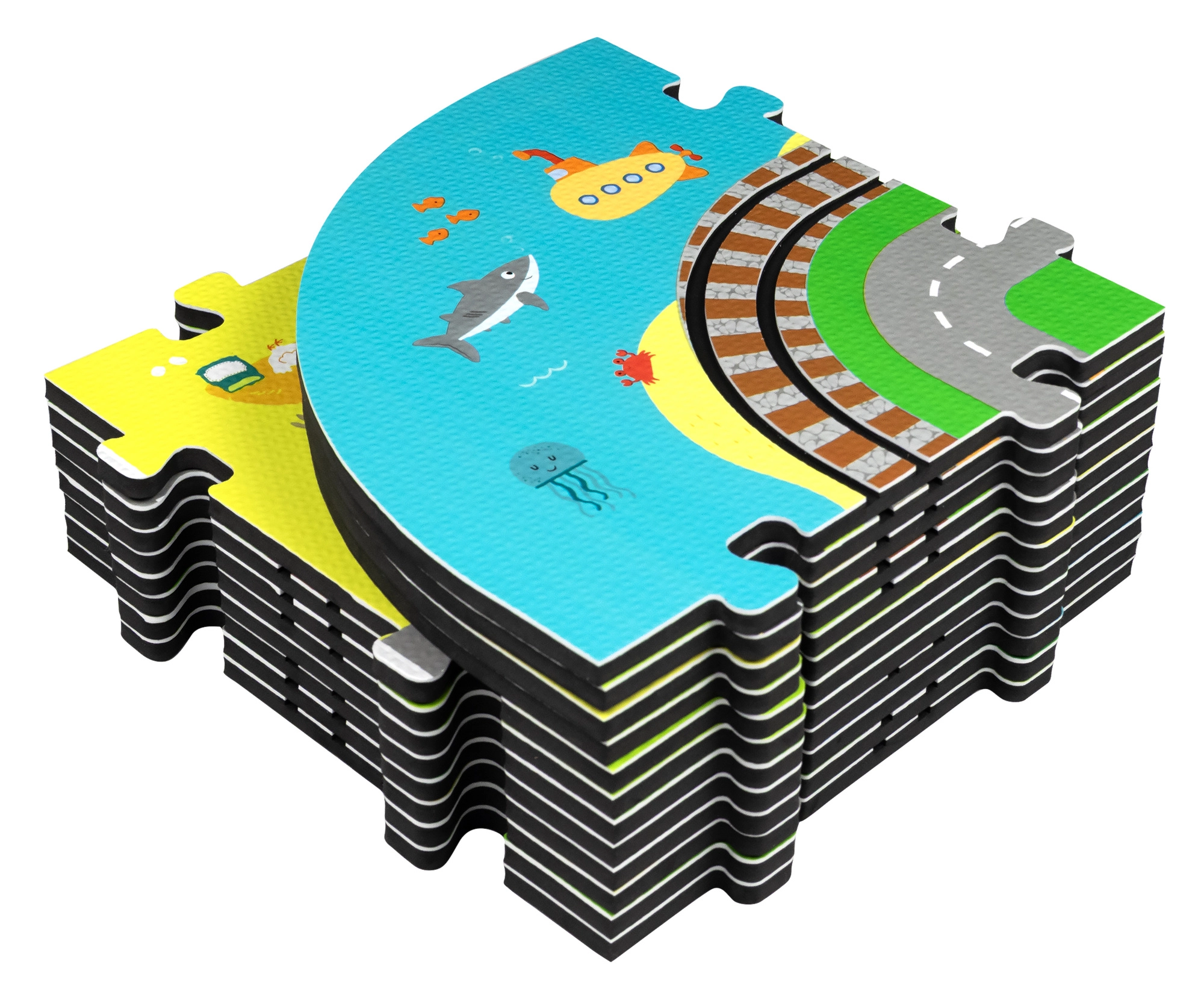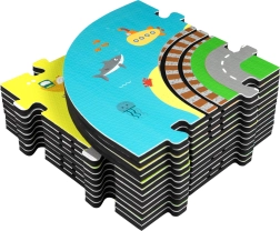 Este set creativo combina una alfombra blanda con una ciudad 3D y un circuito de vías. Los niños construirán una escena colorida con calles, edificios, aeropuerto, granja, mar, campamento y montañas, y dejarán que la locomotora a pilas circule suavemente por la pista montada. Las piezas de espuma EVA de gran grosor amortiguan golpes, aíslan del frío y crean un espacio de juego seguro.