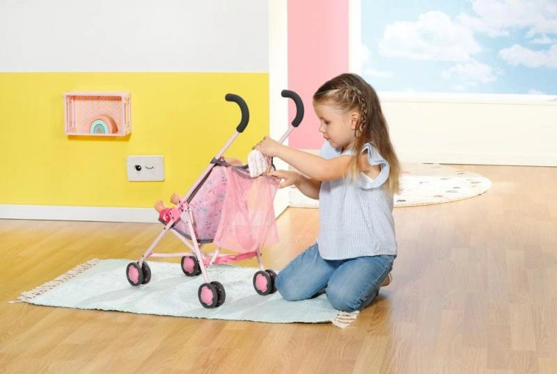 El cochecito infantil para muñecas BABY born es ideal para paseos diarios y para jugar en casa. Su estructura metálica ligera, las cómodas empuñaduras de espuma y las cuatro ruedas dobles facilitan el manejo incluso para las manos pequeñas. El asiento con estampado alegre está equipado con cinturones de seguridad que mantienen a la muñeca en su sitio de forma fiable.