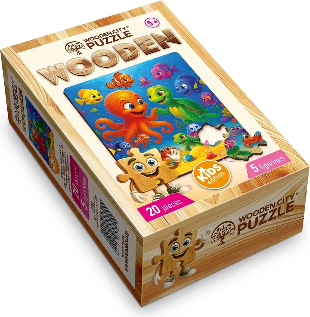 Descubre la magia del mundo submarino con los rompecabezas de madera WOODEN CITY. El set de 20 piezas con motivo de pulpo y tortuga ofrece un montaje divertido, 5 piezas con formas únicas y un acabado láser preciso con bordes lisos sin astillas. Ideal para el desarrollo de la concentración, la paciencia y la creatividad de los niños, e incluye plantilla independiente para un montaje más fácil.