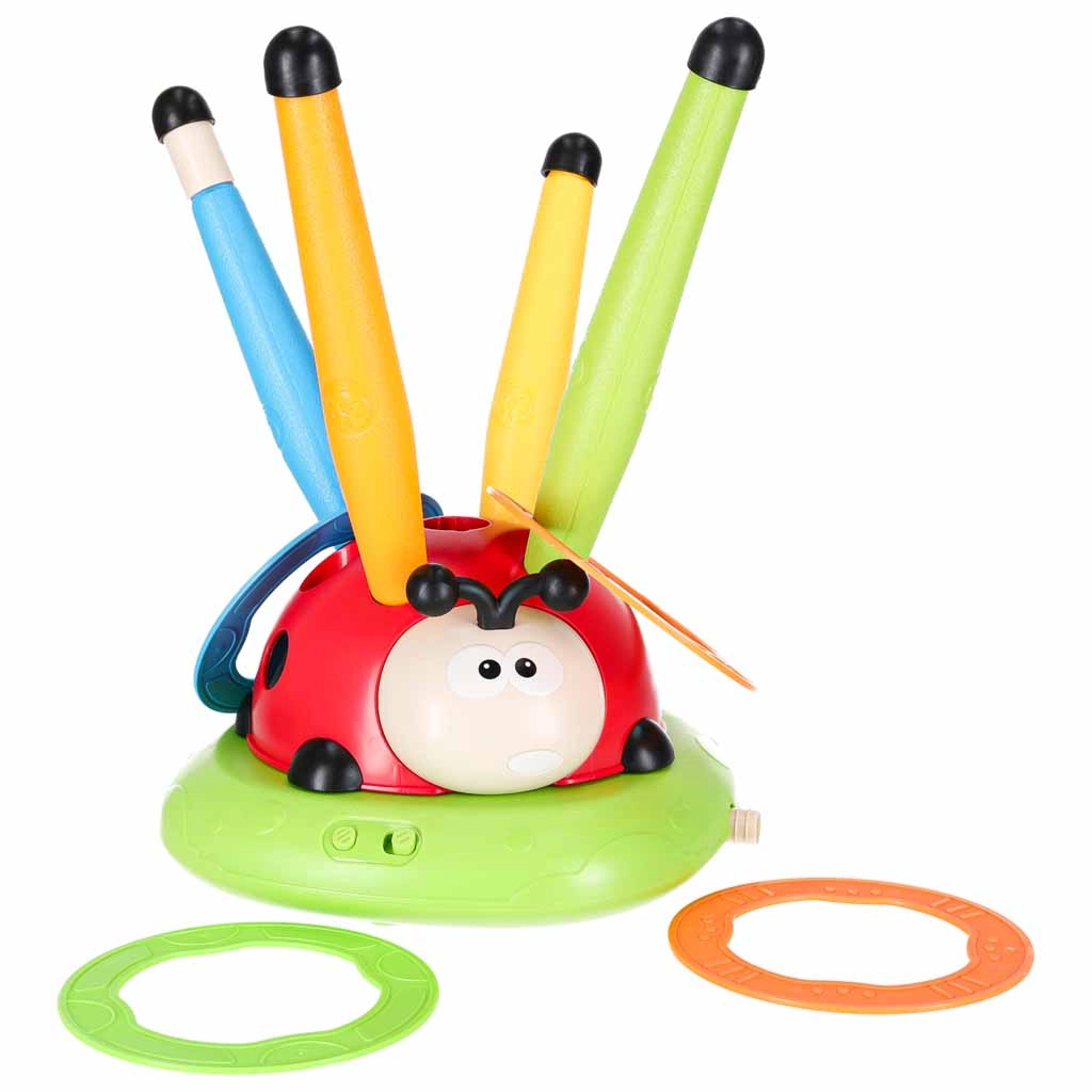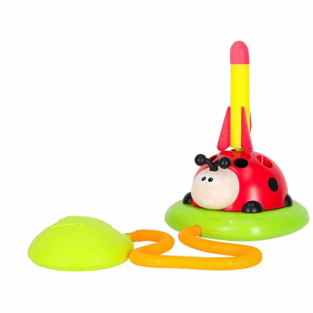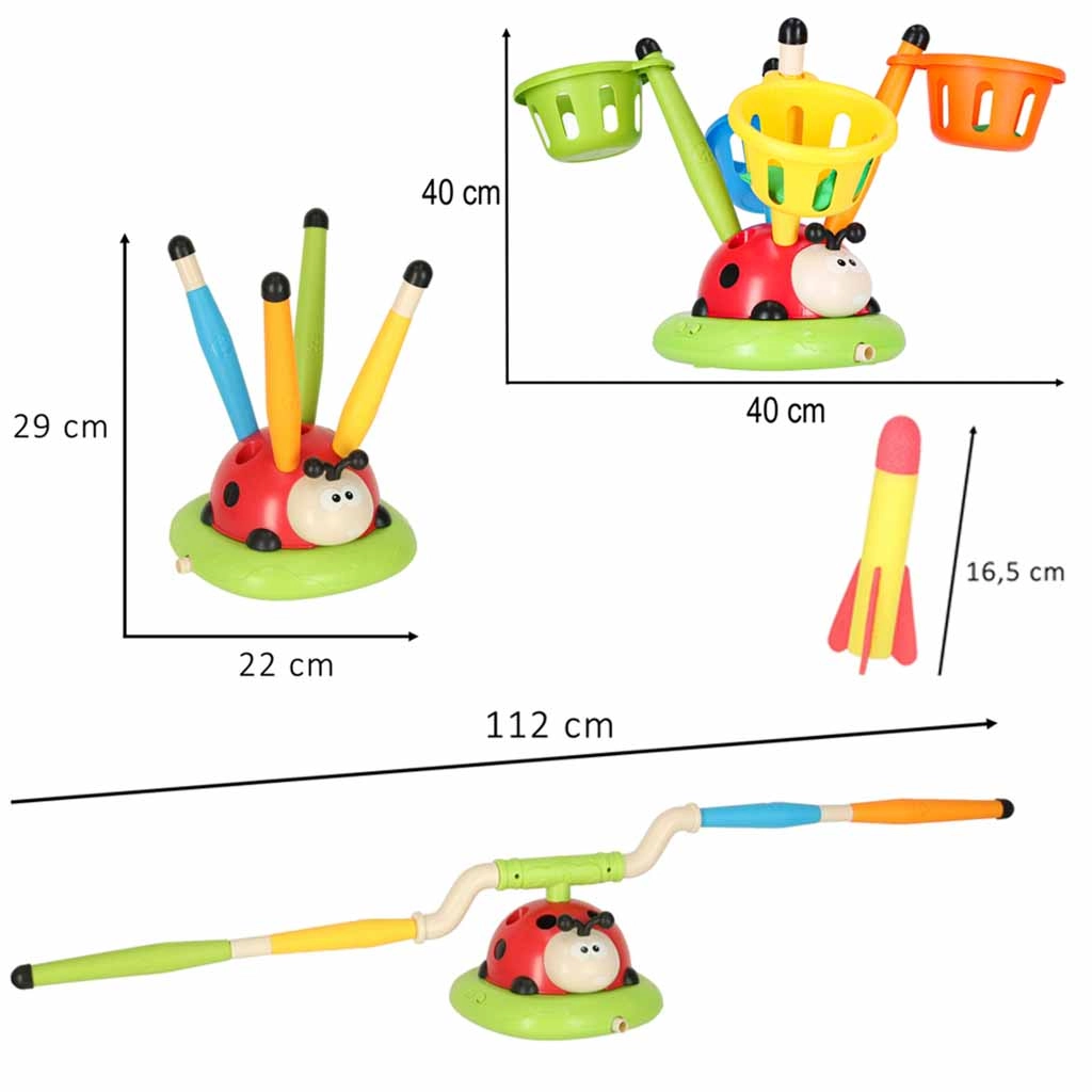 Un juego que no deja a nadie sentado: el obstáculo giratorio para saltar pone a prueba la agudeza, el lanzador de aire envía los cohetes a gran altura y el lanzamiento al blanco añade un toque de competencia deportiva. La mariquita con luces y sonidos motiva al movimiento y convierte cada ronda en un nuevo desafío.