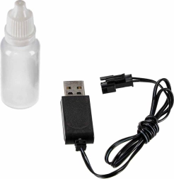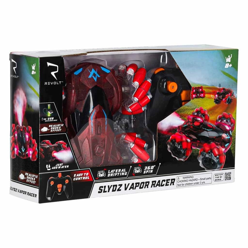 Contenido del paquete: coche RC, mando a distancia, cargador USB, botellita para el agua que genera vapor y manual de uso. Presentado en caja de cartón con ventana de plástico: perfecto también como regalo.