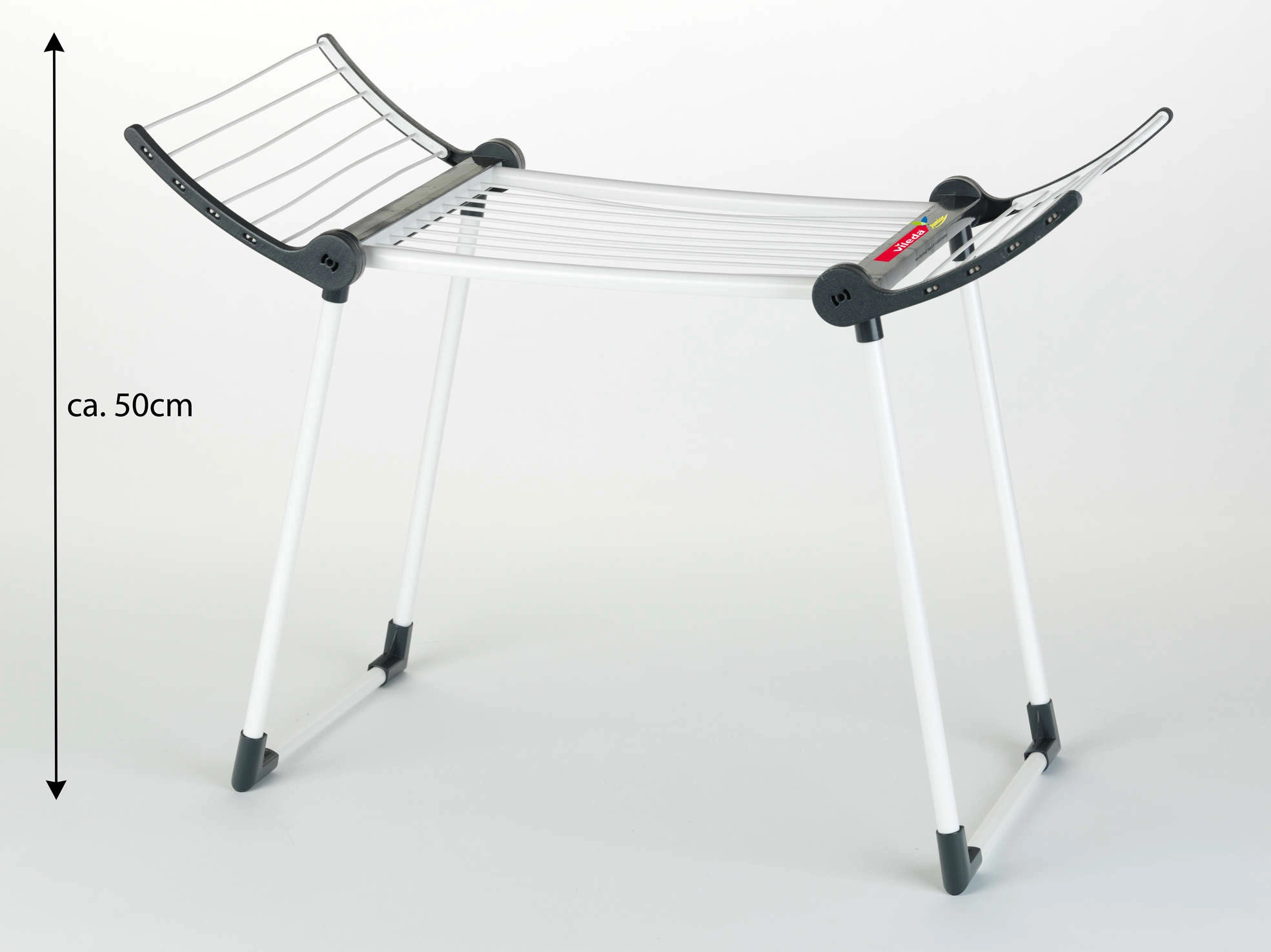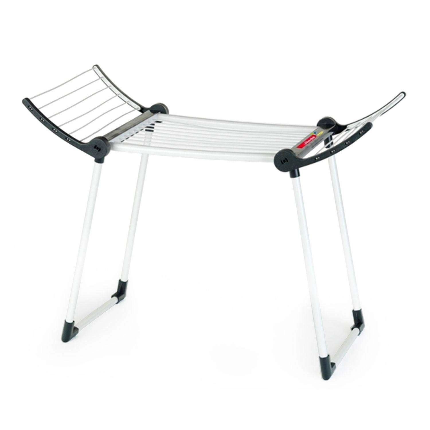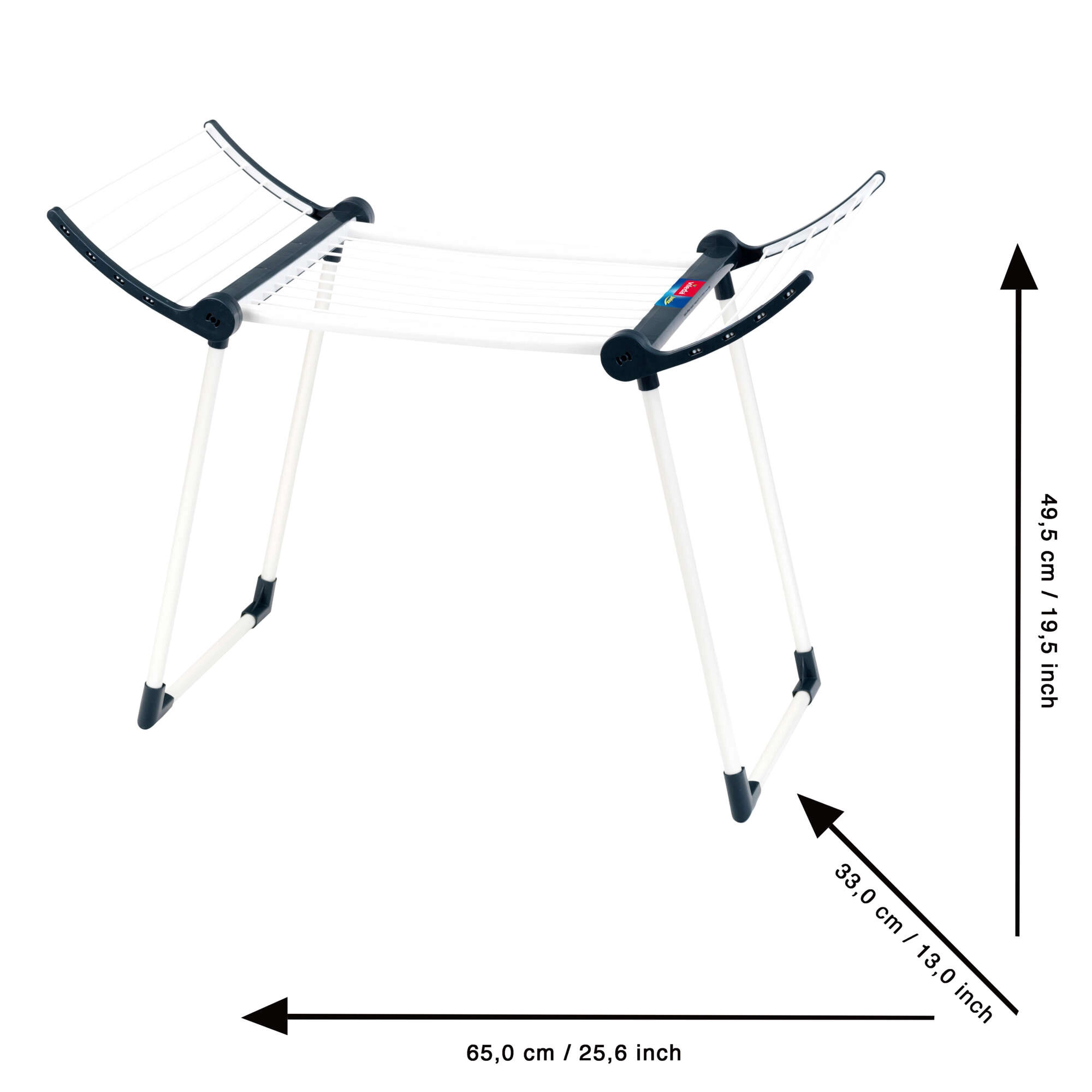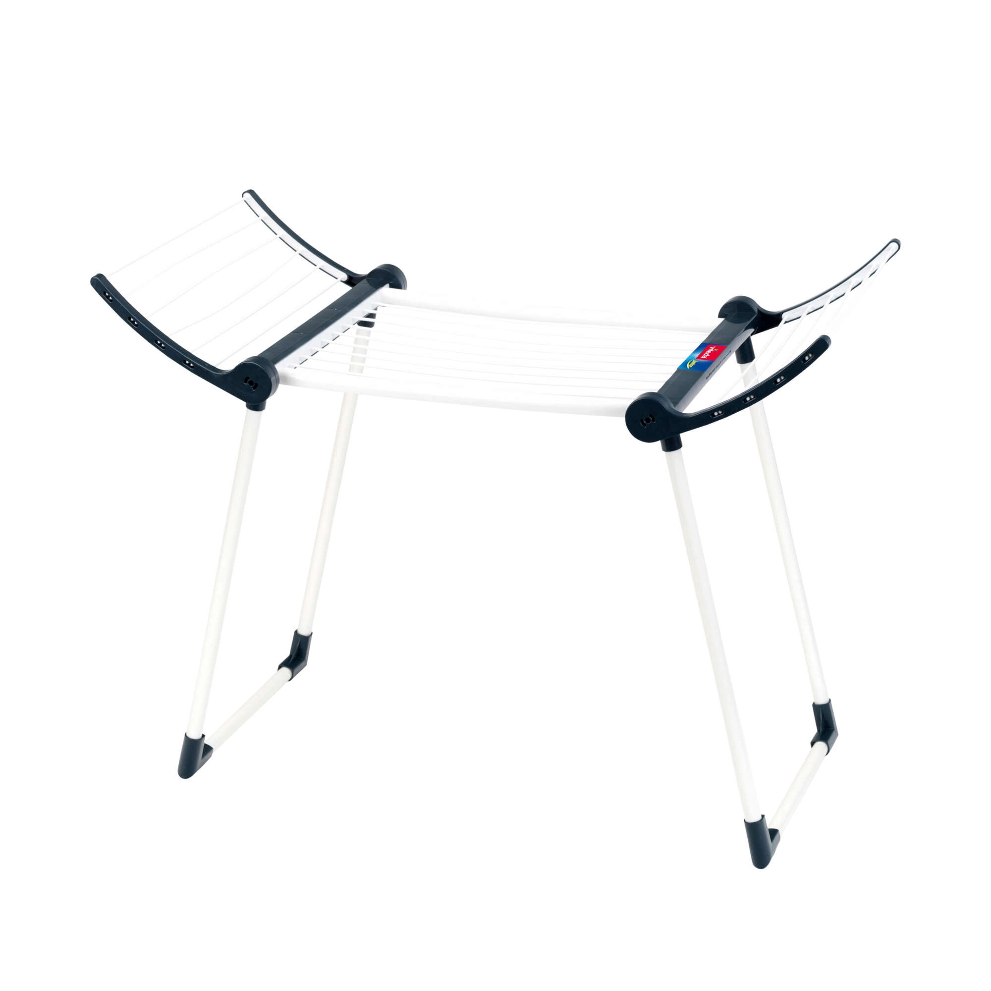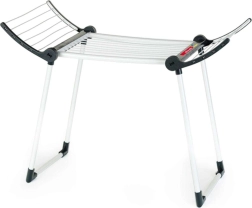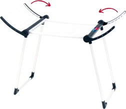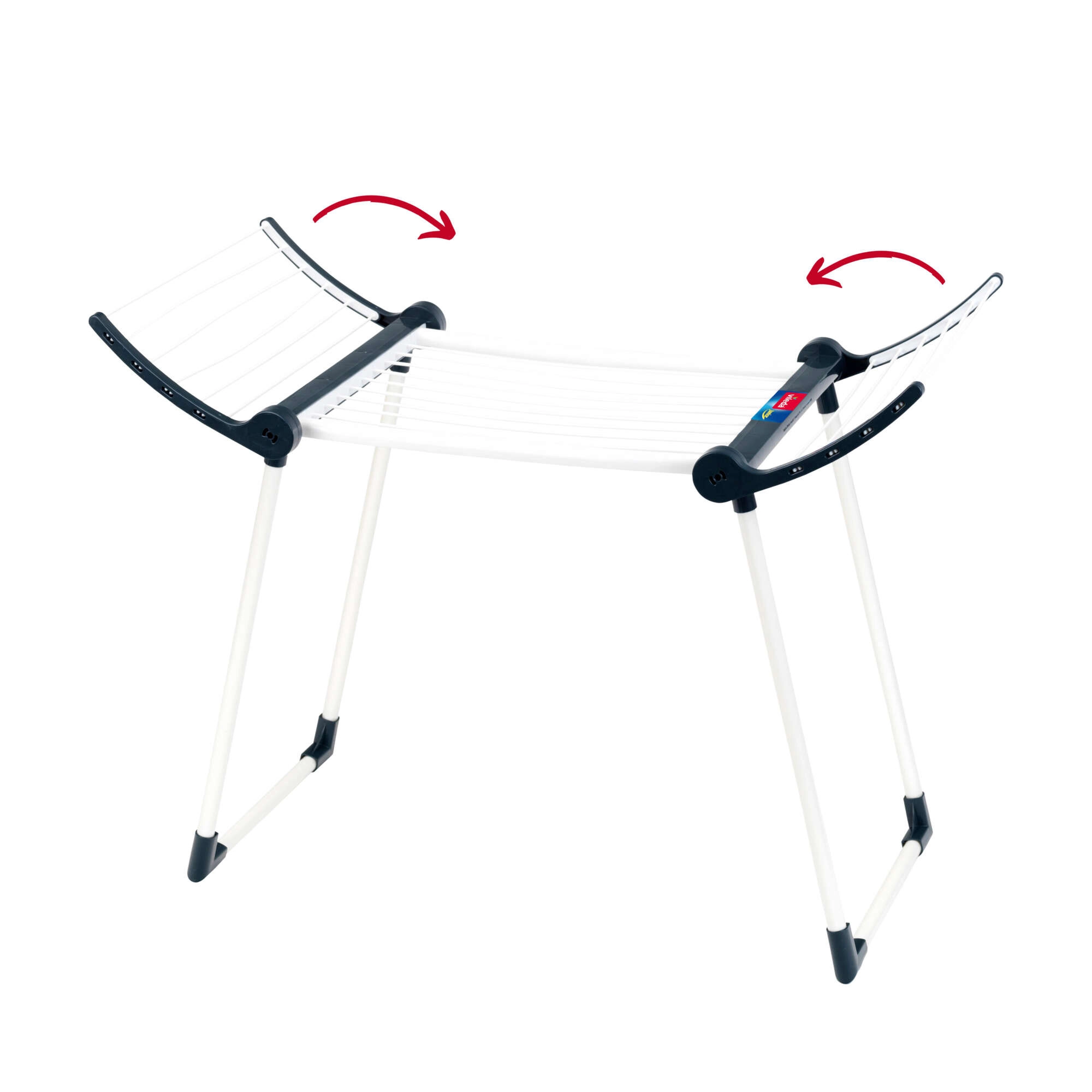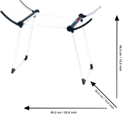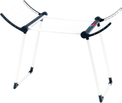 La construcción es firme y estable gracias a las patas dobles; el tendedero es de color blanco con detalles en negro y tiene dos alas abatibles para más superficie de secado. Tras el juego, se pliega fácilmente a un tamaño compacto, ahorrando espacio en la habitación infantil.