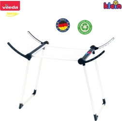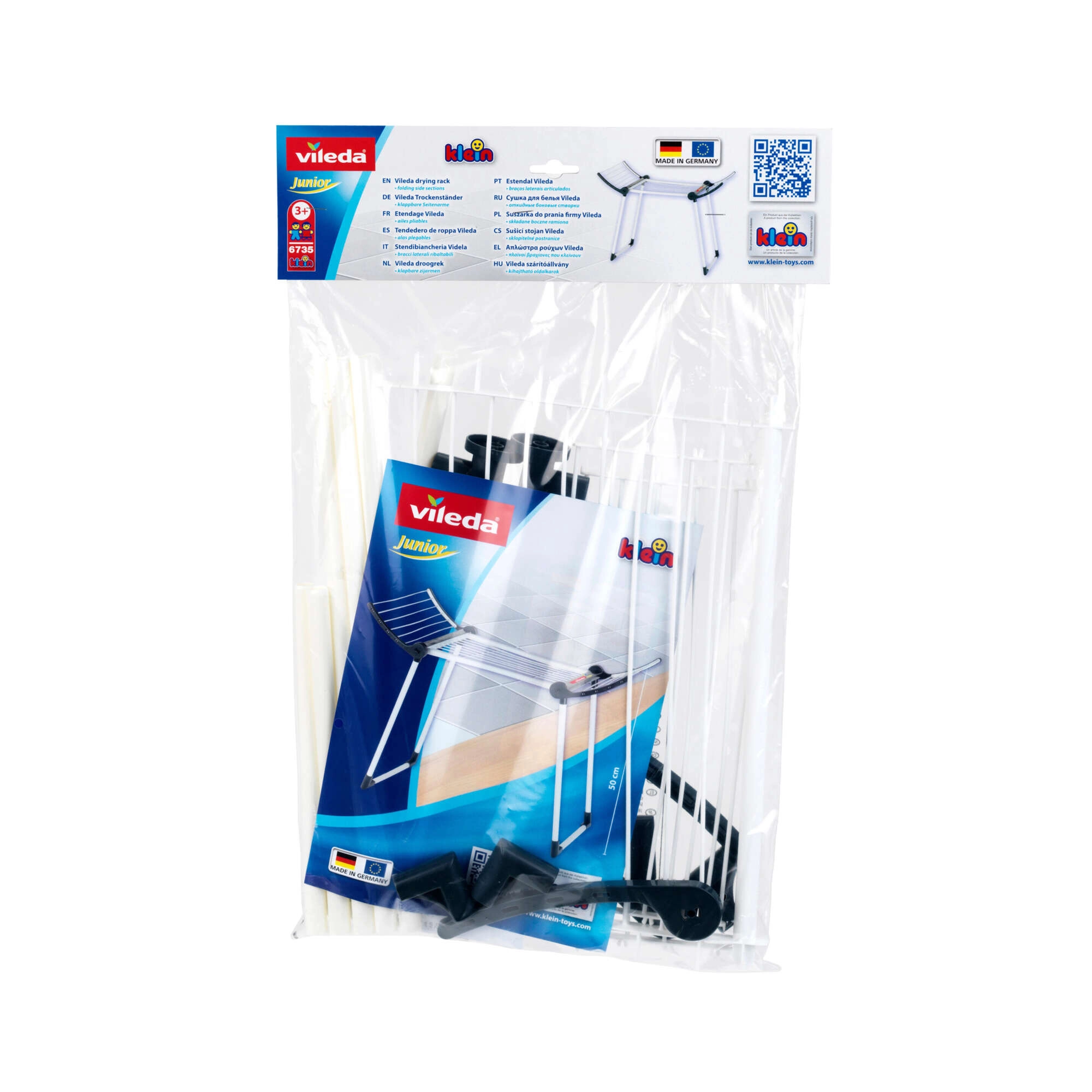 El tendedero infantil Vileda de la marca KLEIN es una fiel réplica de un tendedero real y ofrece a los niños una forma segura y divertida de imitar las tareas del hogar. Está fabricado con gran atención al detalle, cuenta con patas dobles estables, dos alas abatibles y bajo peso. Gracias a la posibilidad de plegarlo a un tamaño más compacto, no ocupa espacio cuando no se utiliza.