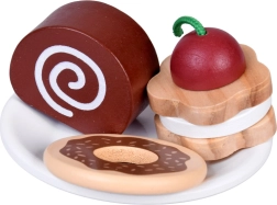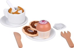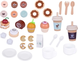 El abundante conjunto de accesorios incluye tazas con platillos y cucharillas, vasos para llevar con tapas (Tea, Coffee), cartón de leche, cubiertos, diversos pastelitos, magdalenas, galletas y chocolatinas, y un sencillo menú. Todo está perfectamente adaptado a las manos pequeñas y favorece la motricidad fina, la coordinación ojo–mano y las habilidades sociales.