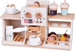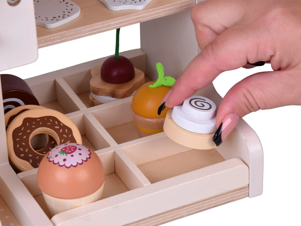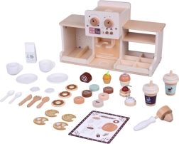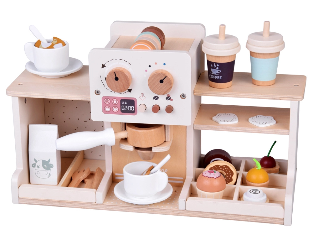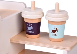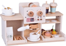 Descubre la magia del mundo barista con esta cafetería de madera que parece y funciona como una real. Los niños pueden “ajustar” la intensidad del café con mandos giratorios, colocar el portafiltro, elegir cápsulas de café o té, espumar “leche” y servir postres en platitos. La sólida estructura de madera con pinturas seguras y una suave paleta pastel garantiza durabilidad y un bonito aspecto en la habitación infantil.