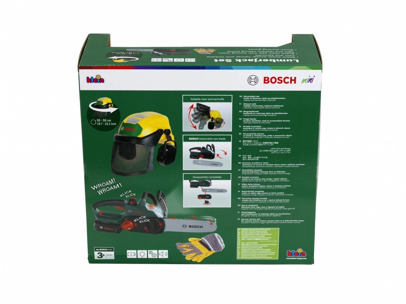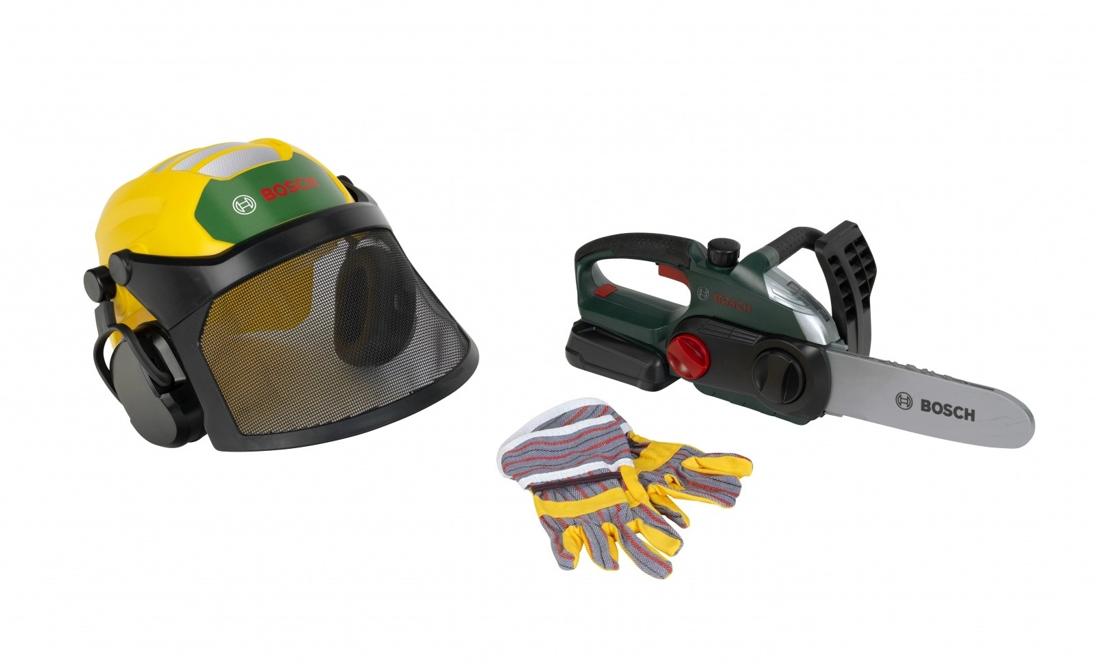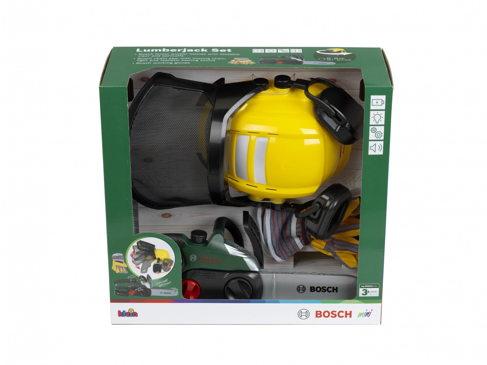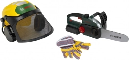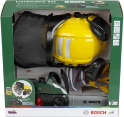 El set infantil de leñador BOSCH está diseñado para un juego seguro y estimulante. La motosierra electrónica, al colocar la espada, emite un sonido de corte auténtico y una luz intermitente que simula el funcionamiento de una herramienta real. El casco ajustable con visera y “auriculares” integrados aporta realismo y enseña a los niños las bases de la seguridad.