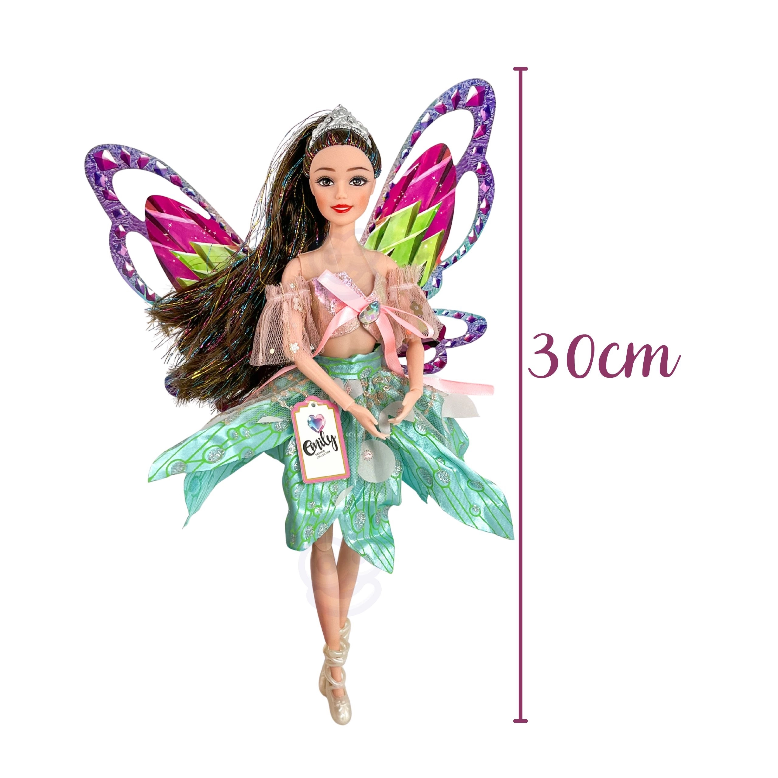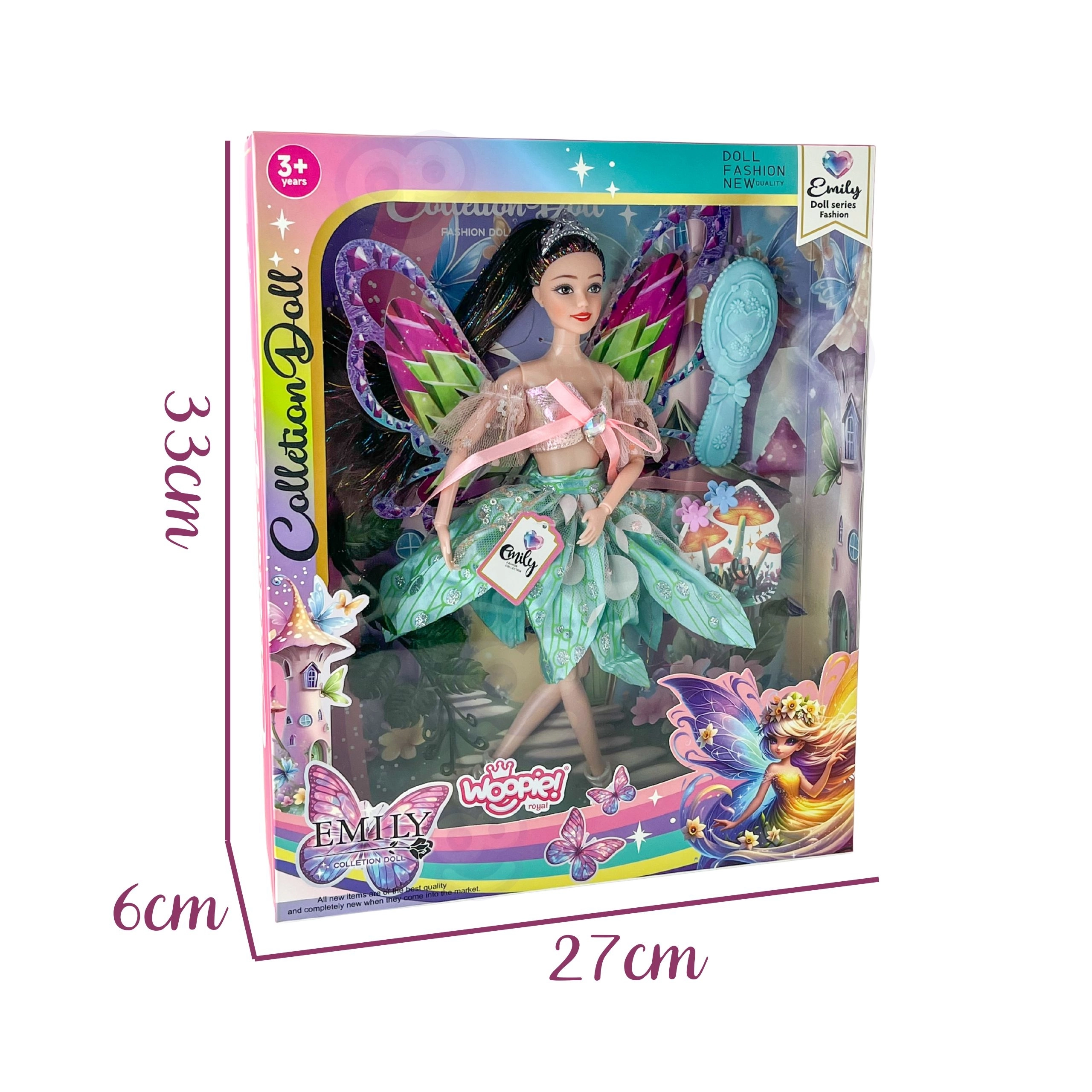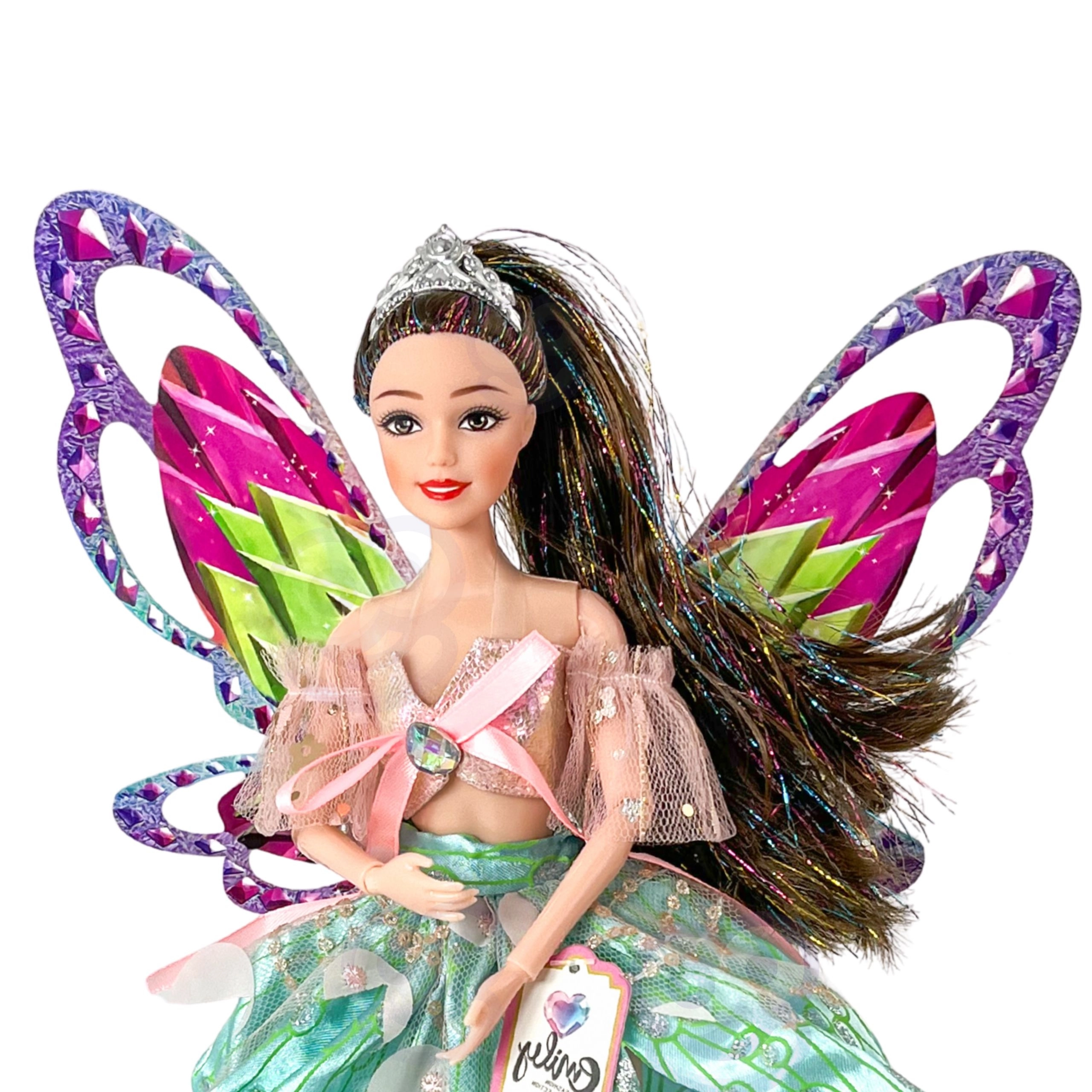 La muñeca Emily es perfecta para pequeños soñadores que aman los cuentos, la moda y las aventuras mágicas. Sus grandes alas de colores y los detalles brillantes crean el efecto de un hada real, mientras que el elegante vestido con mangas de tul resulta festivo y fotogénico.