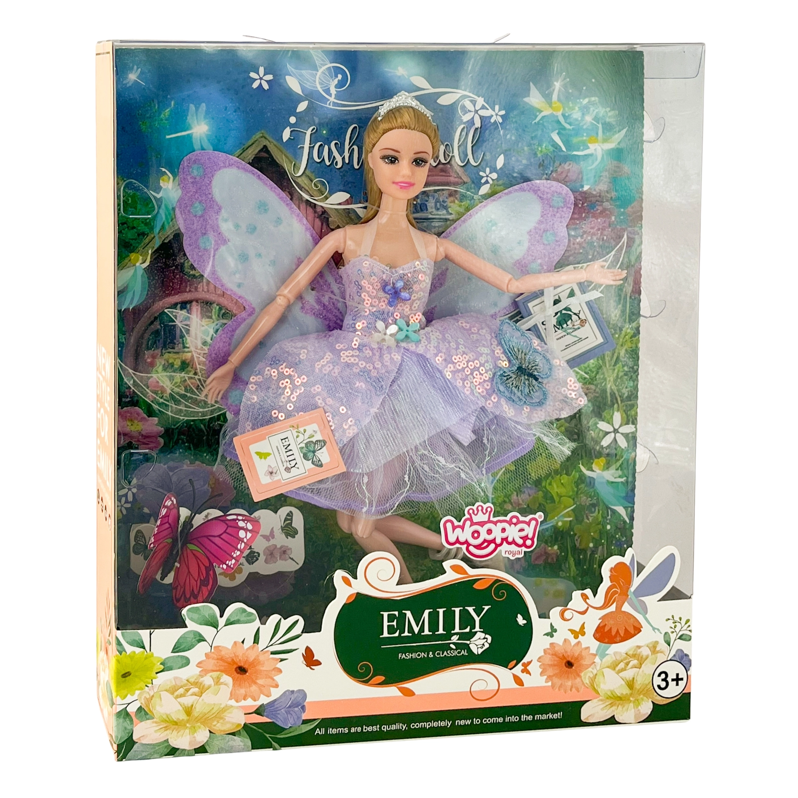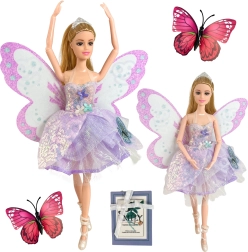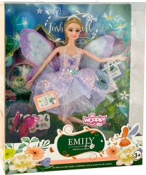 Descubre el mundo de la fantasía con la muñeca hada Emi, que encanta con sus brillantes alas de mariposa, vestido lila pastel y extremidades articuladas. Una elegante corona, zapatos con estilo y una fabricación de calidad con materiales seguros convierten cada juego en una historia mágica: una gran idea para regalo.