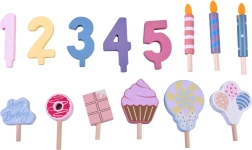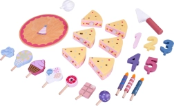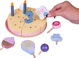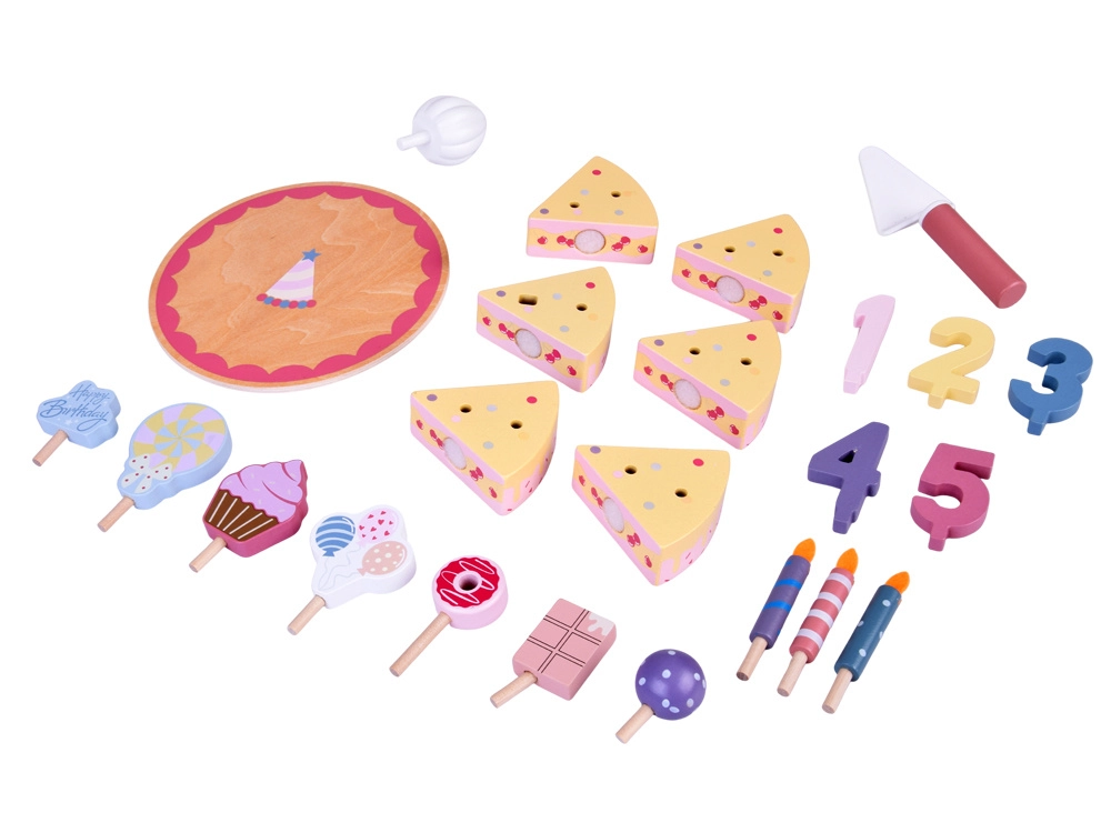¡Monta tu propia fiesta de cumpleaños! La tarta de madera consta de 6 porciones que pueden “cortarse” y volver a unirse, y decorarse con velas, números y dulces intercambiables. El set es ideal para jugar en grupo, aprender colores, contar y practicar un servicio cortés.
