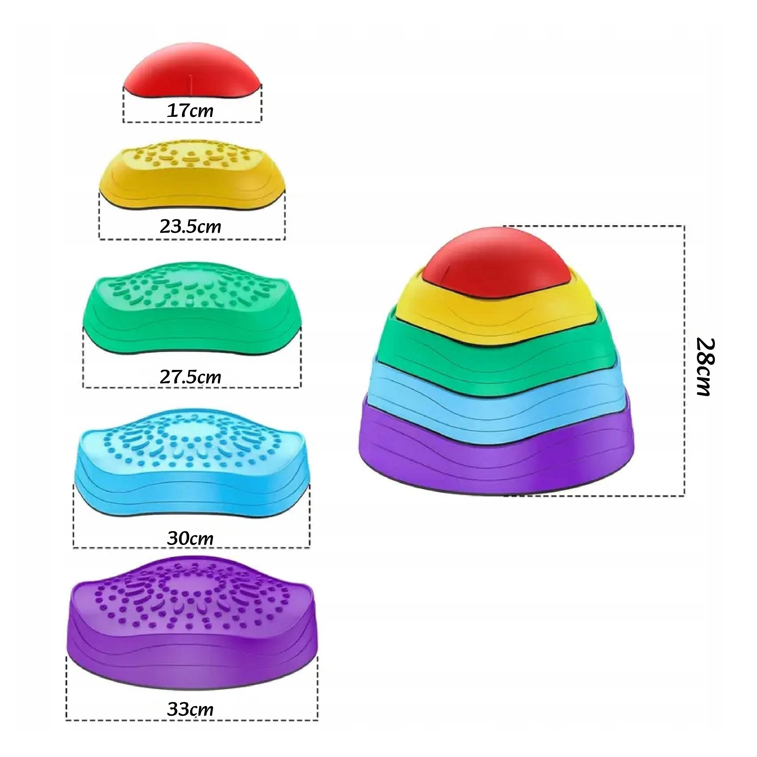 Gracias a la base antideslizante, las piedras se mantienen estables durante el juego y su superficie texturizada estimula la percepción sensorial de pies y manos. El diseño apilable ahorra espacio al guardar y los colores llamativos invitan de forma natural al movimiento.