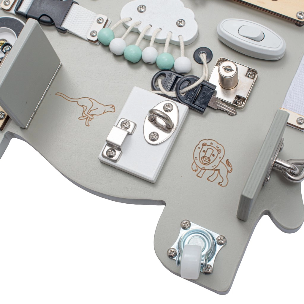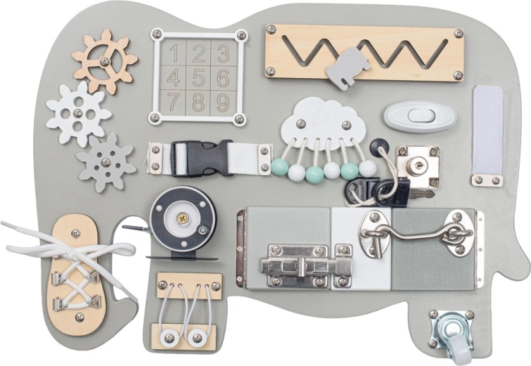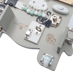 Este tablero activo Montessori educativo aporta a los niños estímulos reales de la vida cotidiana y los motiva a explorar de forma independiente. El elegante diseño de elefante encaja perfectamente en cualquier interior y, gracias a la madera resistente, soporta incluso un uso intensivo.