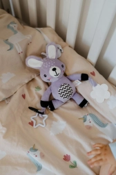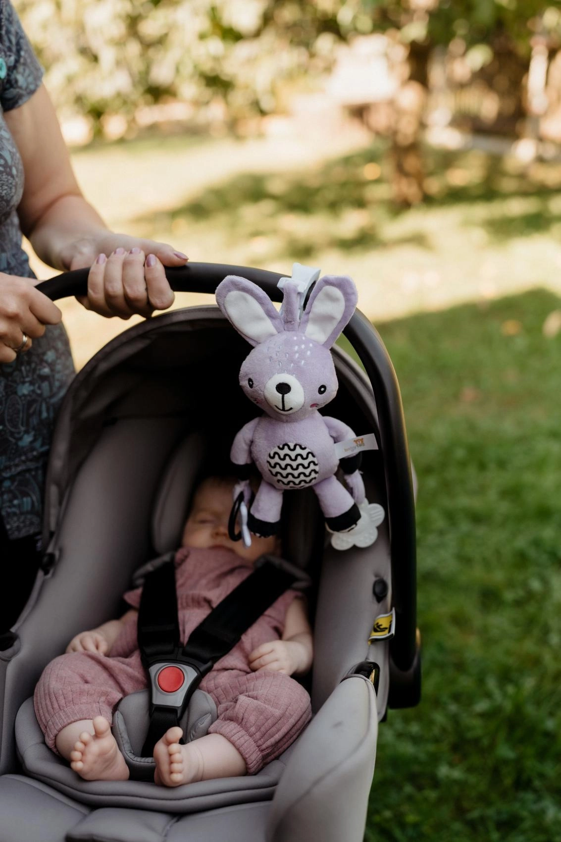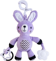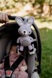 Este suave conejito colgante será el primer amiguito de tu bebé en casa y de viaje. Gracias al clip universal, lo fijarás fácilmente al cochecito, a la silla de auto, a la cuna o al gimnasio de juegos. Su cuerpecito de peluche invita a acurrucarse, mientras que las orejas con sonajero y los detalles de alto contraste estimulan la visión y la audición.