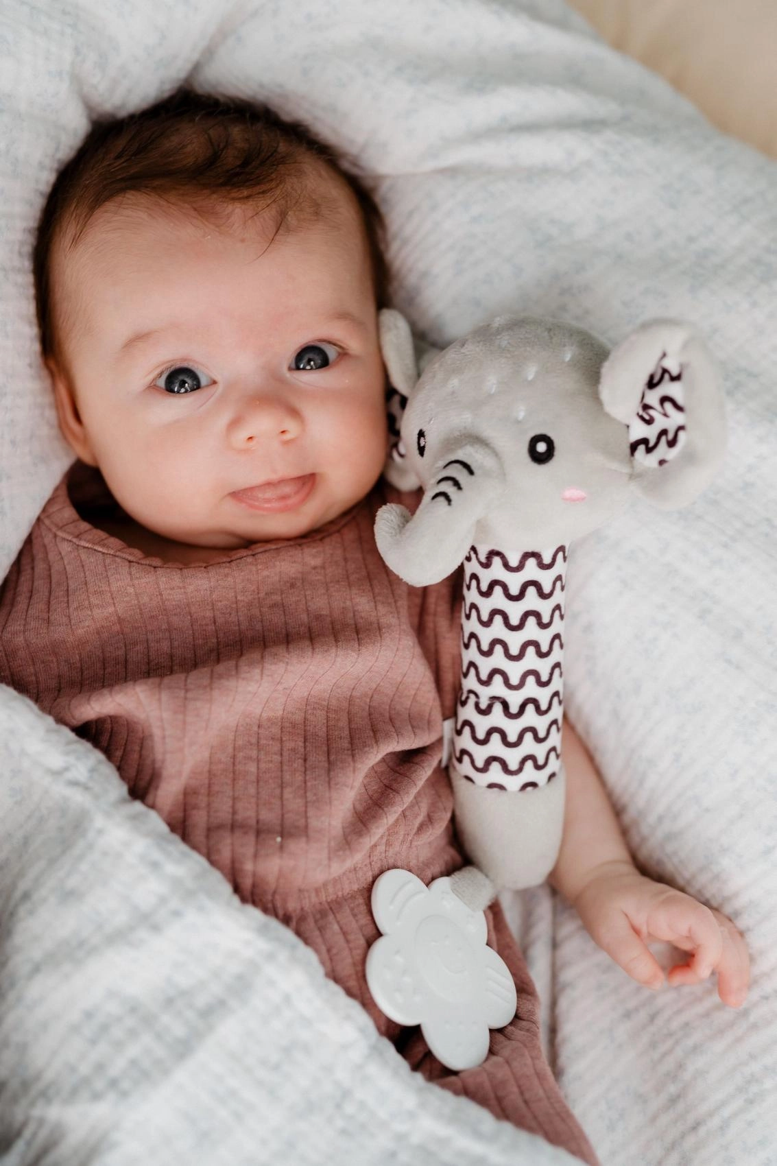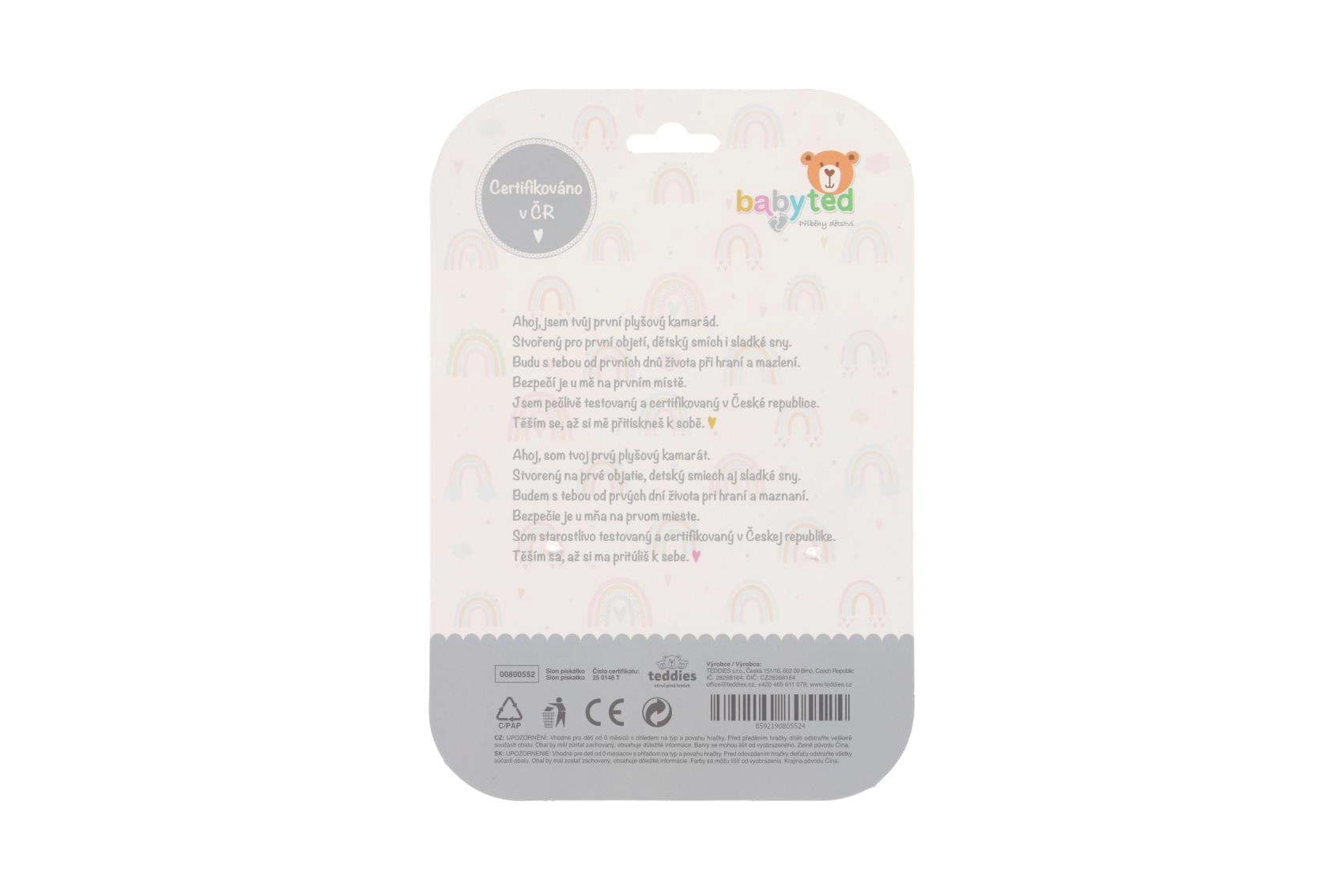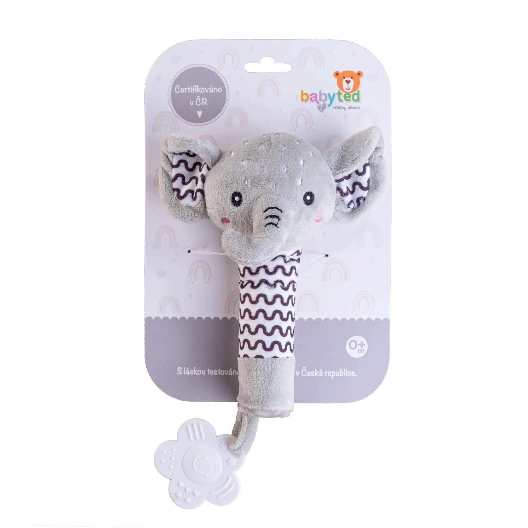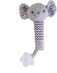 Adorable sonajero de peluche con mordedor en forma de elefante de la marca BABYTED que encantará a los bebés desde el nacimiento. Tiene un cuerpo suave para un agarre fácil, emite un suave pitido al presionarlo y en el extremo del asa incluye un mordedor blando con forma de flor para aliviar las encías sensibles. Los patrones contrastantes favorecen la percepción visual y el peluche seguro y suave es delicado con los más pequeños. Certificado en la República Checa según estrictas normas de seguridad.