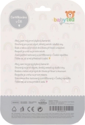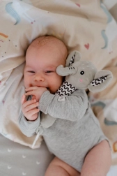 En el extremo del asa hay un mordedor de plástico blando con forma de flor que ayuda a aliviar las encías sensibles durante la dentición. Los patrones contrastantes en las orejas y el cuerpo favorecen la percepción visual y el desarrollo sensorial. El juguete está certificado en la República Checa, por lo que cumple estrictos estándares de seguridad para niños 0m+.