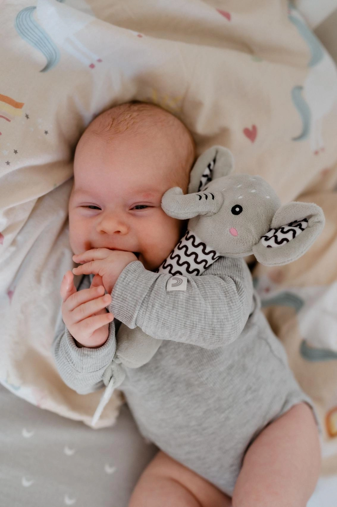 El elefante de peluche con sonajero y mordedor es el juguete ideal para recién nacidos. Gracias a su forma ergonómica y alargada, se sujeta fácilmente incluso con manos pequeñitas; el suave pitido estimula la audición y capta la atención del bebé. El material suave y seguro proporciona una agradable sensación al tacto y resulta reconfortante al abrazarlo.
