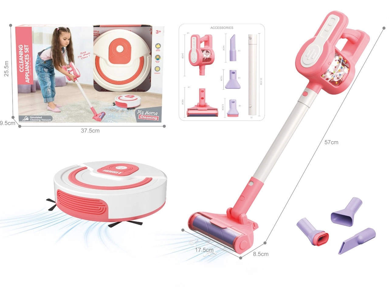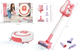 Divertido y realista set de limpieza infantil con aspiradora de palo y robot aspirador, ideal para pequeños ayudantes a partir de 3 años. Ofrece bolitas de colores en remolino en una cámara transparente, boquillas intercambiables y un robot con efecto de succión y cepillos giratorios. Fabricado con materiales seguros, fomenta la creatividad, la motricidad fina y el hábito del orden.