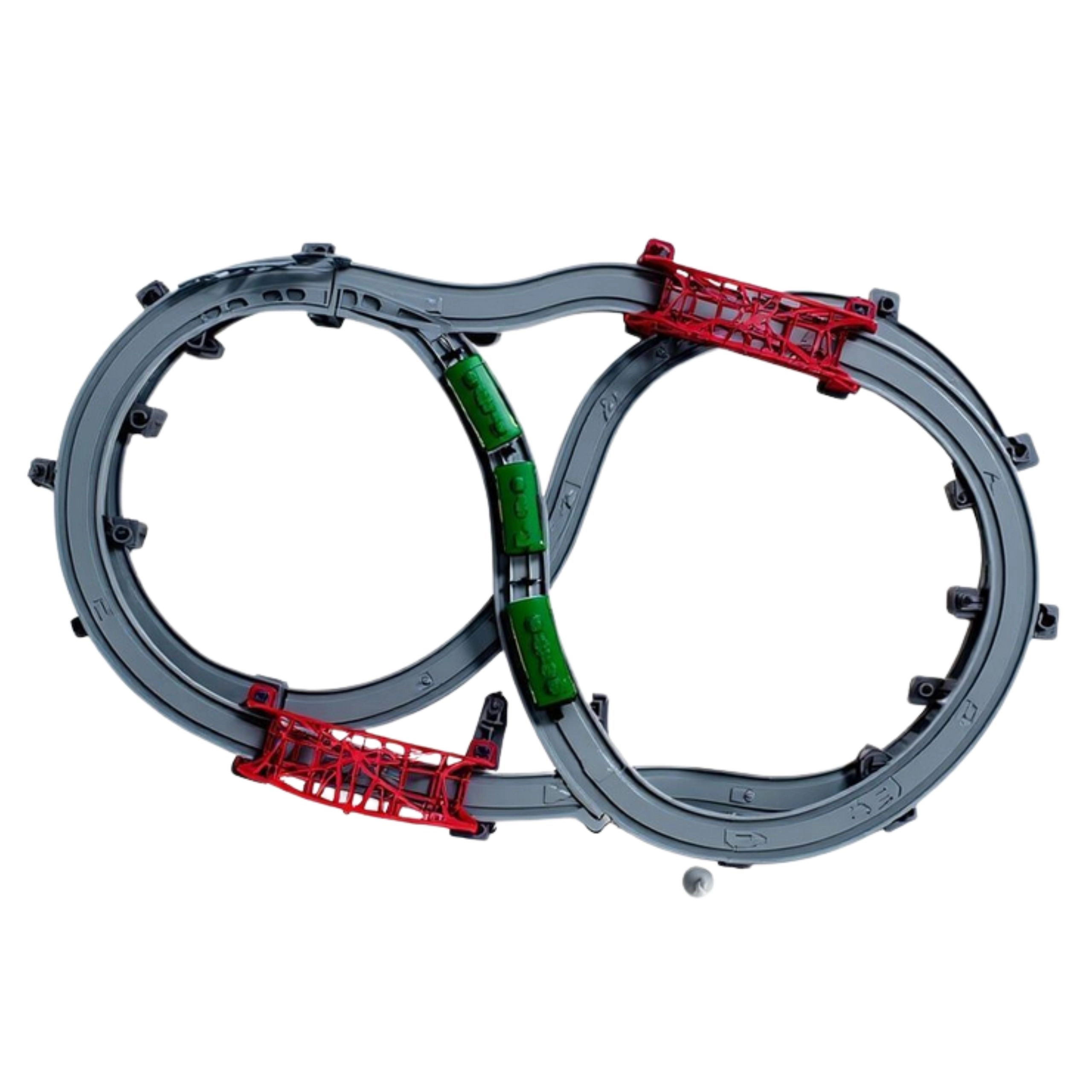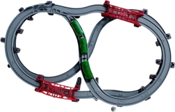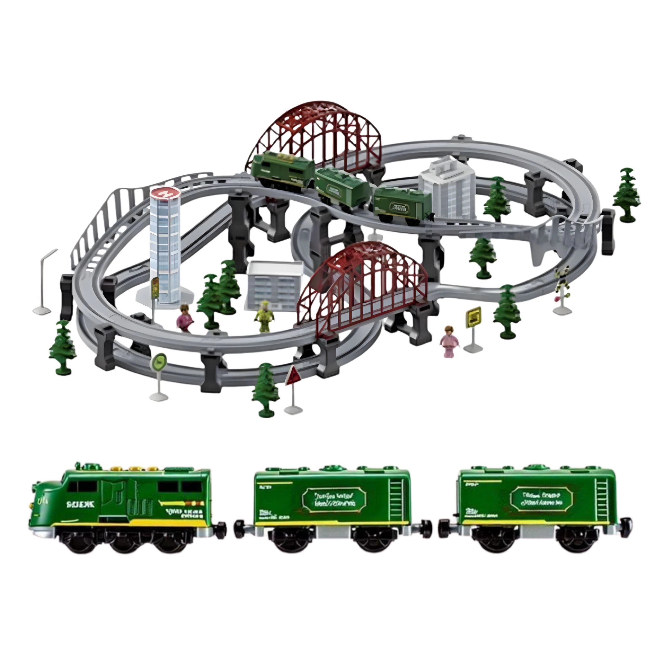 - locomotora, 2 vagones, vías rectas y curvas, puentes, viaductos, desvíos, figuras, señales de tráfico, árboles, edificios, instrucciones