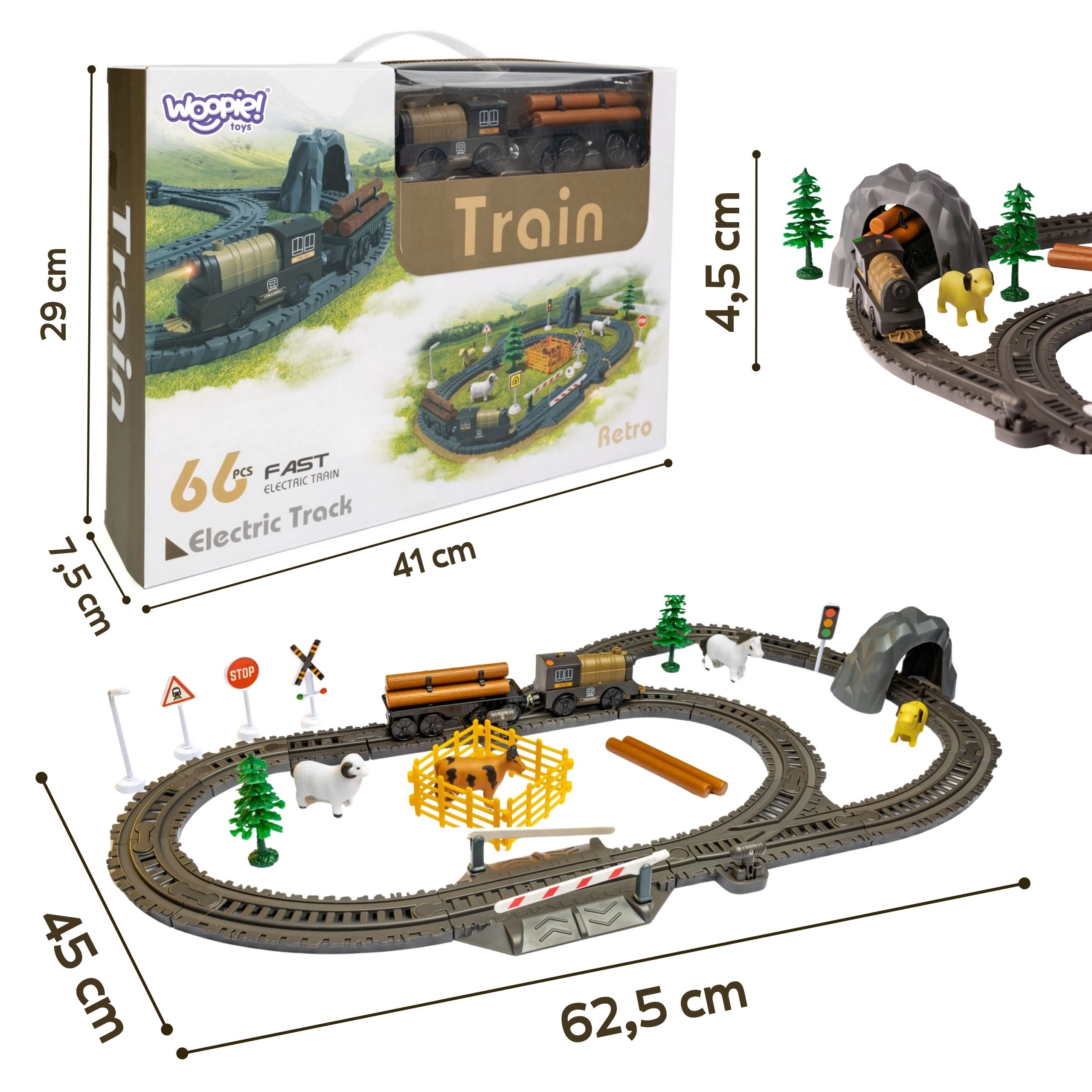 Este tren eléctrico retro de WOOPIE brinda horas de diversión para niños y adultos. La locomotora a pilas avanza y retrocede, ilumina con su luz delantera y circula suavemente por las vías de colores gracias a los ingeniosos desvíos. Con su amplio equipamiento, es posible construir distintas rutas y escenarios, desde circuitos simples hasta trazados ramificados.