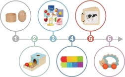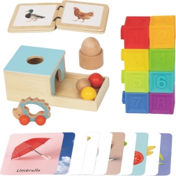 El set incluye un libro de madera con animales, bloques blandos con números, una caja de permanencia del objeto con pelotas, un huevo de madera con vasito, un erizo–cochecito y un juego de tarjetas de palabras. Cada actividad desarrolla una habilidad diferente: motricidad fina, reconocimiento de formas y números, vocabulario y percepción visuo–memoria.