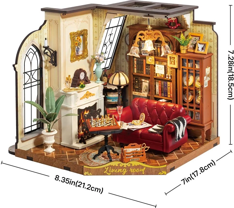 Construye una elegante mini sala de estar con ricos tonos de madera, suelo en mosaico y luz cálida. Este modelo 3D de madera combina diseño hermoso y detalles bien pensados —desde fina porcelana y lámpara de pie hasta el tablero de ajedrez y estantes llenos de libros. Ideal como decoración, regalo y proyecto creativo relajante.