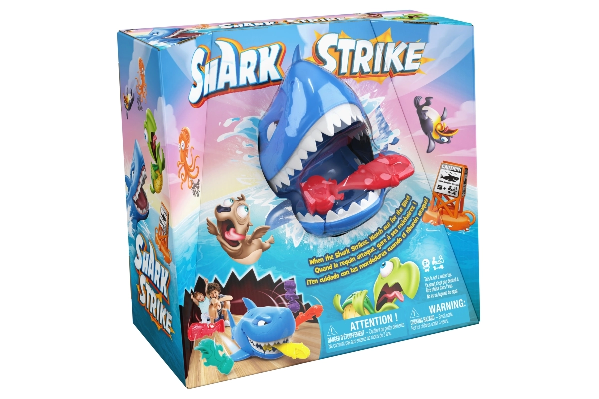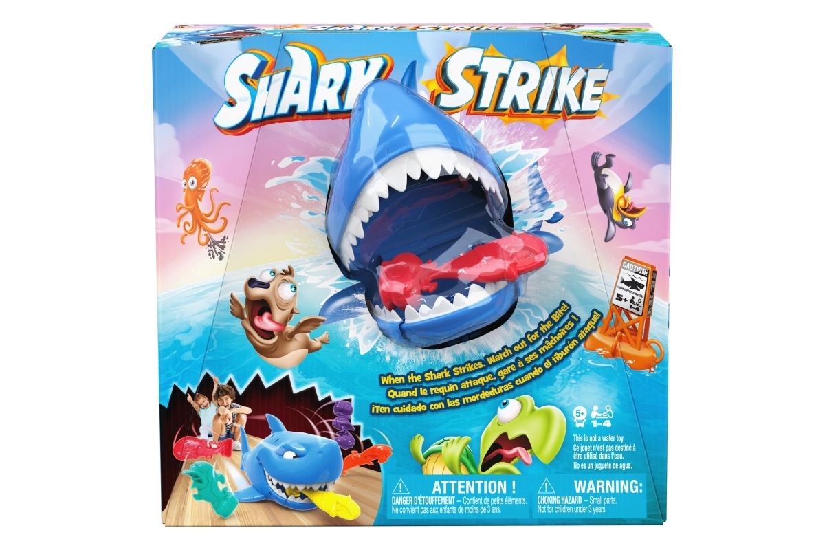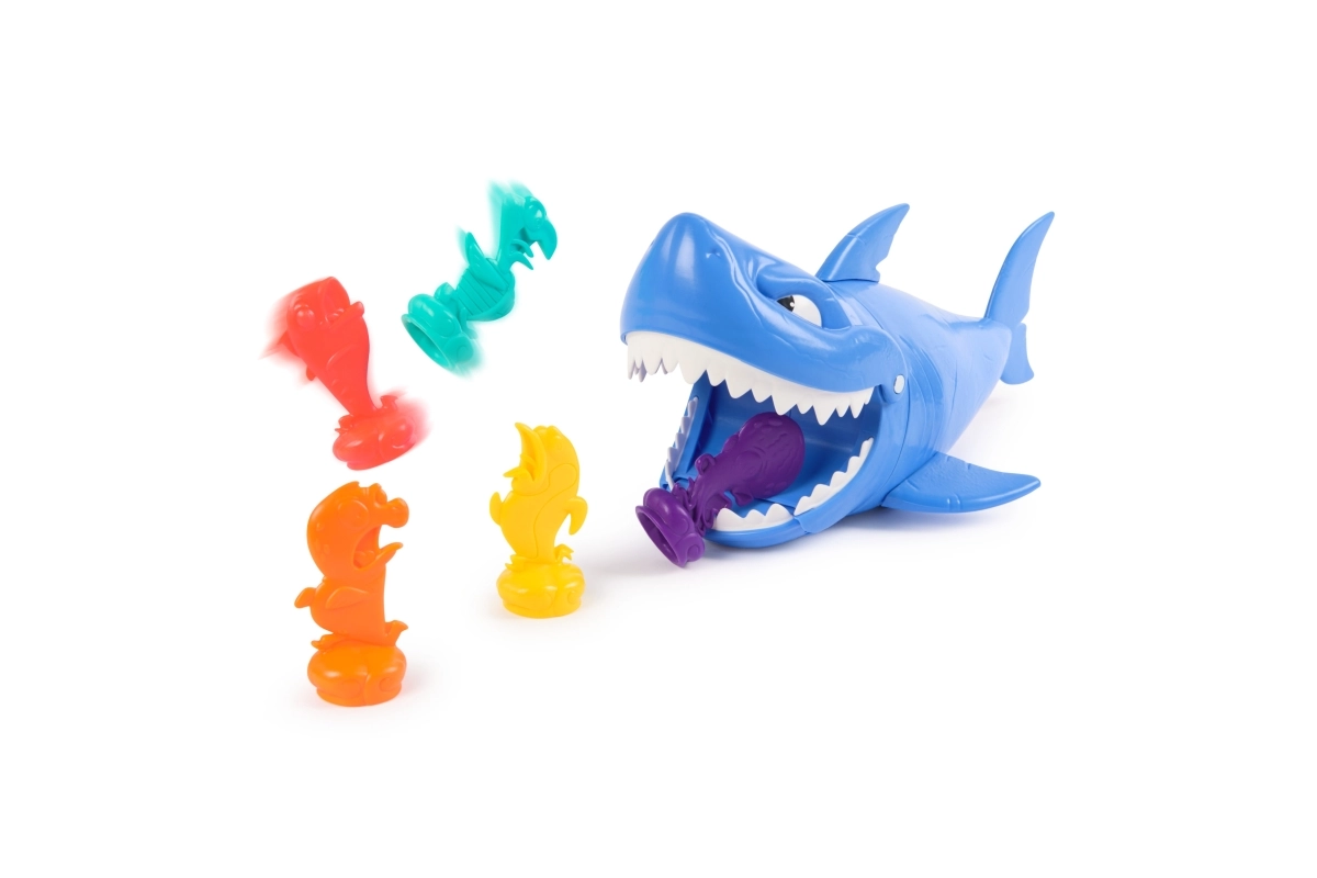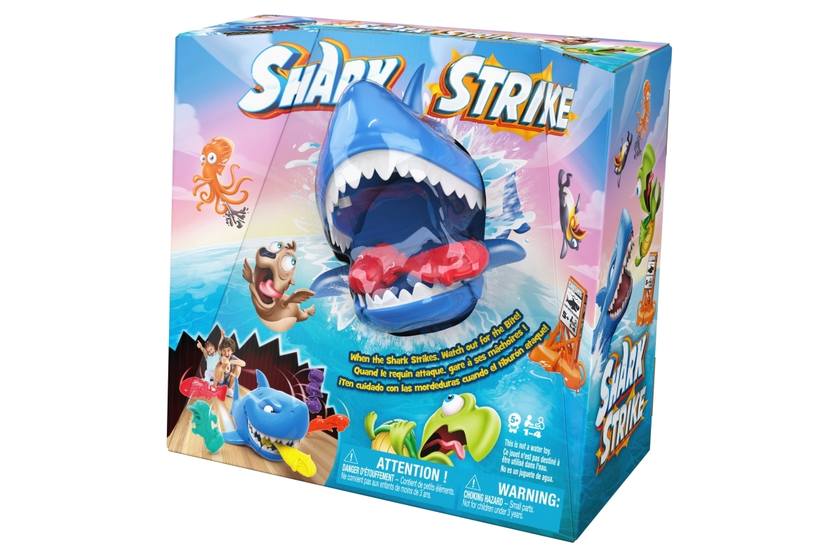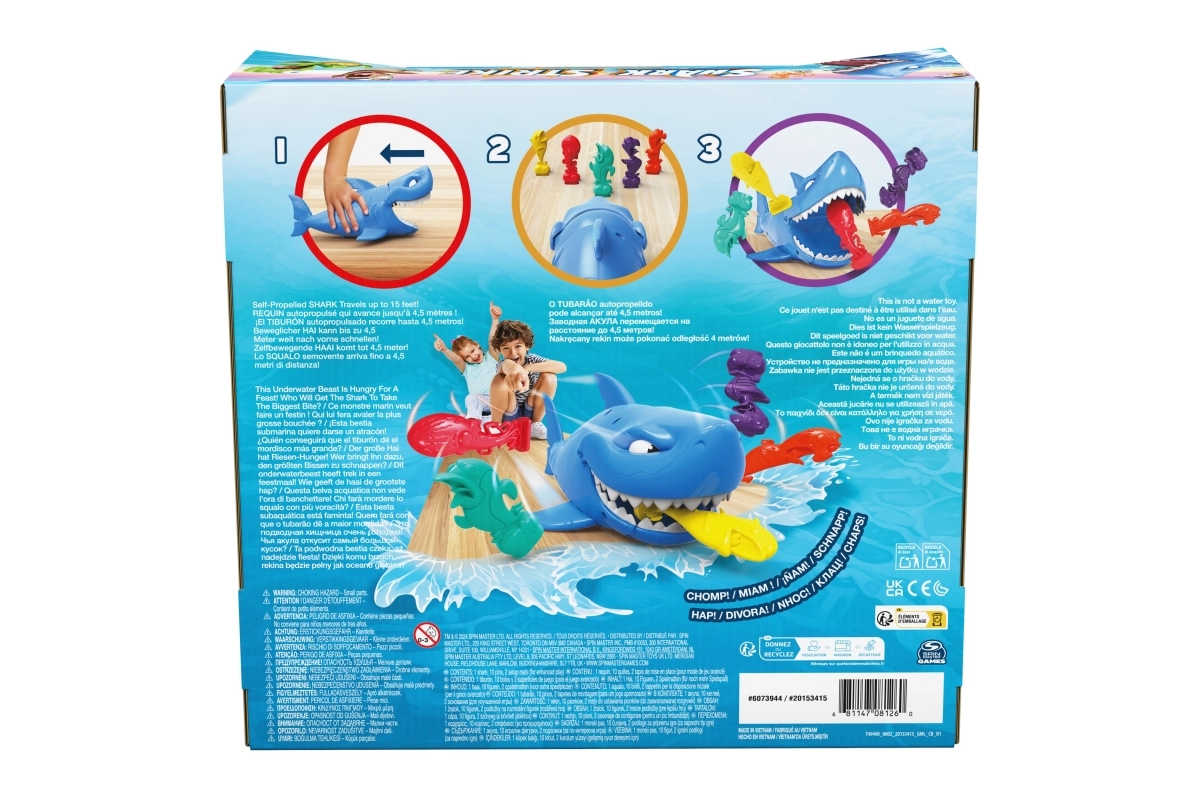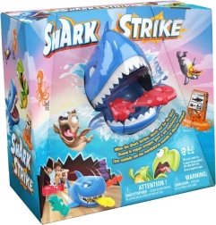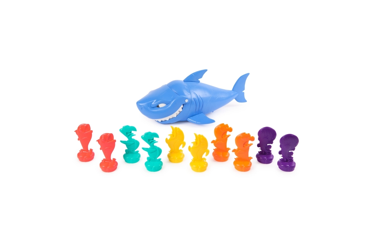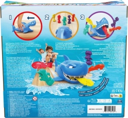 ¡Pon en marcha al tiburón, apunta a los pececitos del rival y disfruta de mucha diversión! Los jugadores colocan sus figuras de colores en el suelo; el más joven empieza, da cuerda al tiburón y lo envía a la acción. El objetivo es, en tres intentos, quitarle al oponente el mayor número posible de pececitos; quien capture más, gana.