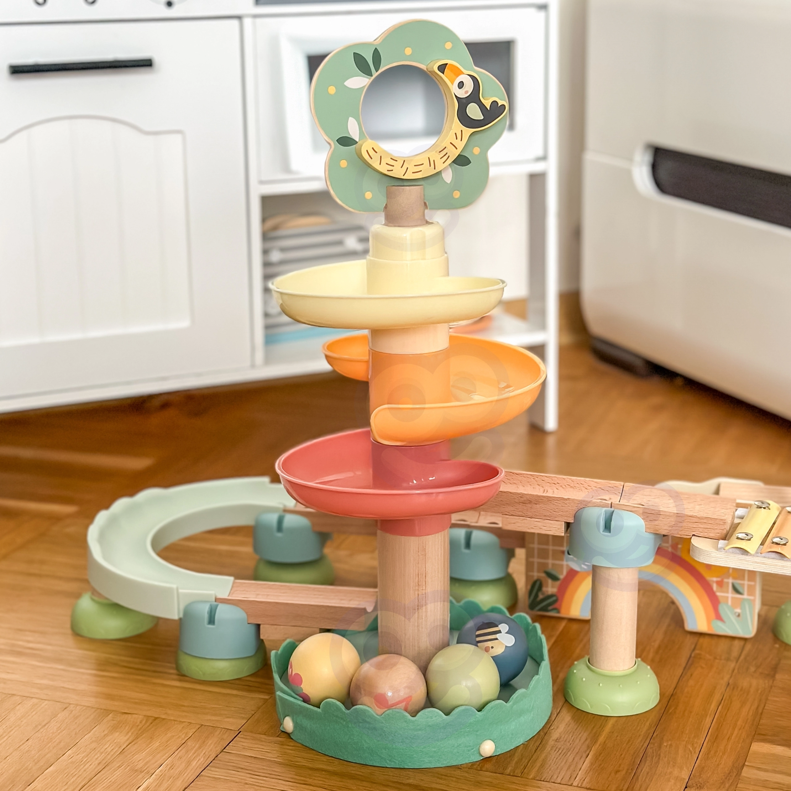 Esta pista de canicas de alta calidad combina movimiento, sonido y exploración curiosa. Los niños observan cómo las canicas ruedan por las curvas, cruzan puentes y activan la sección musical con xilófono, lo que favorece el ritmo, la concentración y la alegría del juego. Los suaves tonos pastel con motivos de la naturaleza crean un ambiente tranquilo y encajan de maravilla en cualquier habitación infantil.