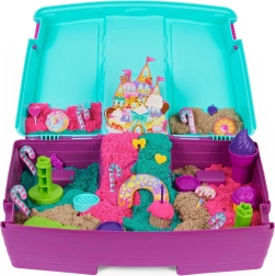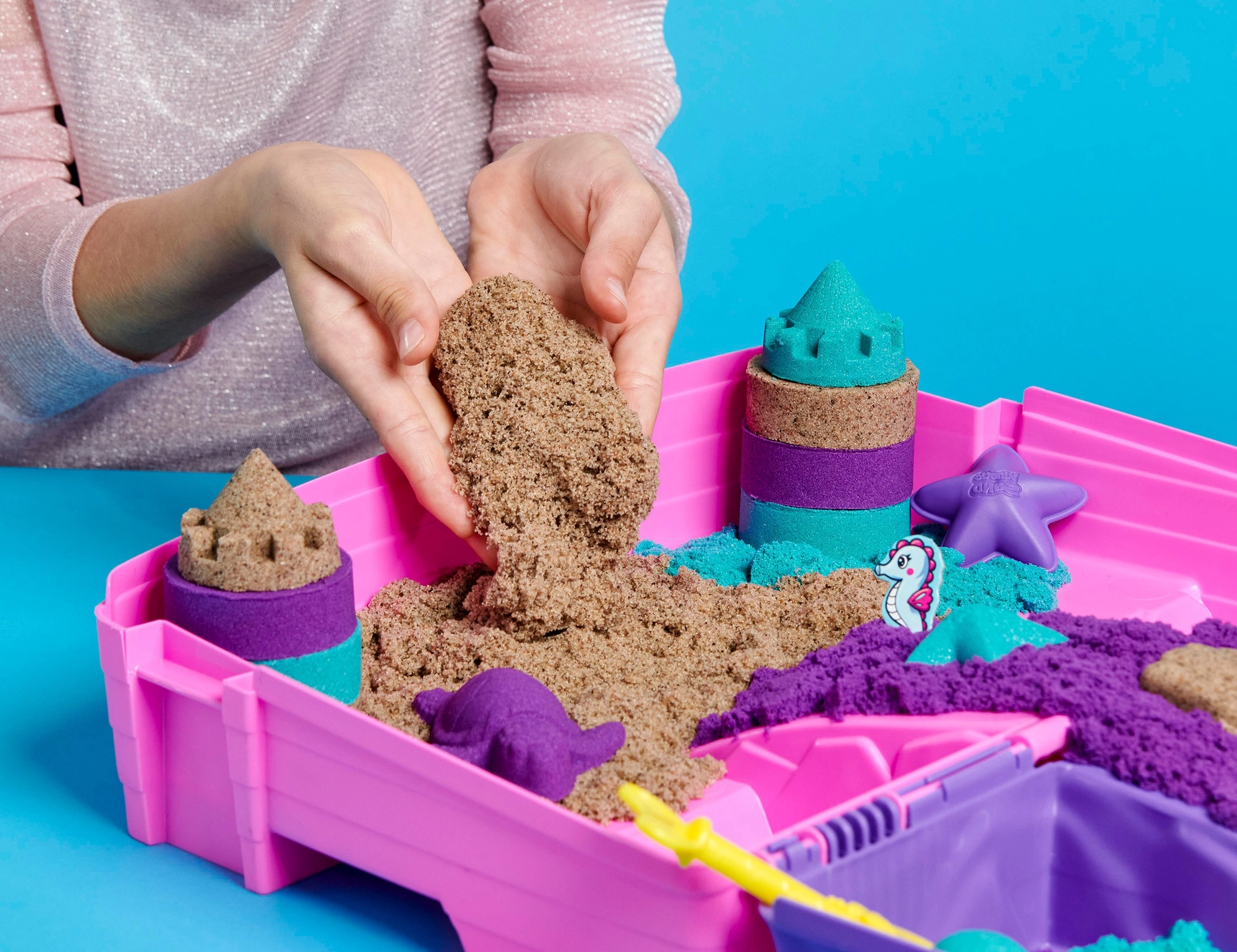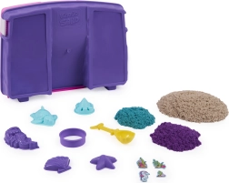 La textura única de Kinetic Sand hace que los granitos se atraigan, por lo que la masa no se dispersa por la habitación y los modelos conservan bordes limpios. Los niños crean fácilmente castillos, torres, conchas, estrellas de mar, tortuguitas o sirenas. El set es adecuado a partir de 3 años.