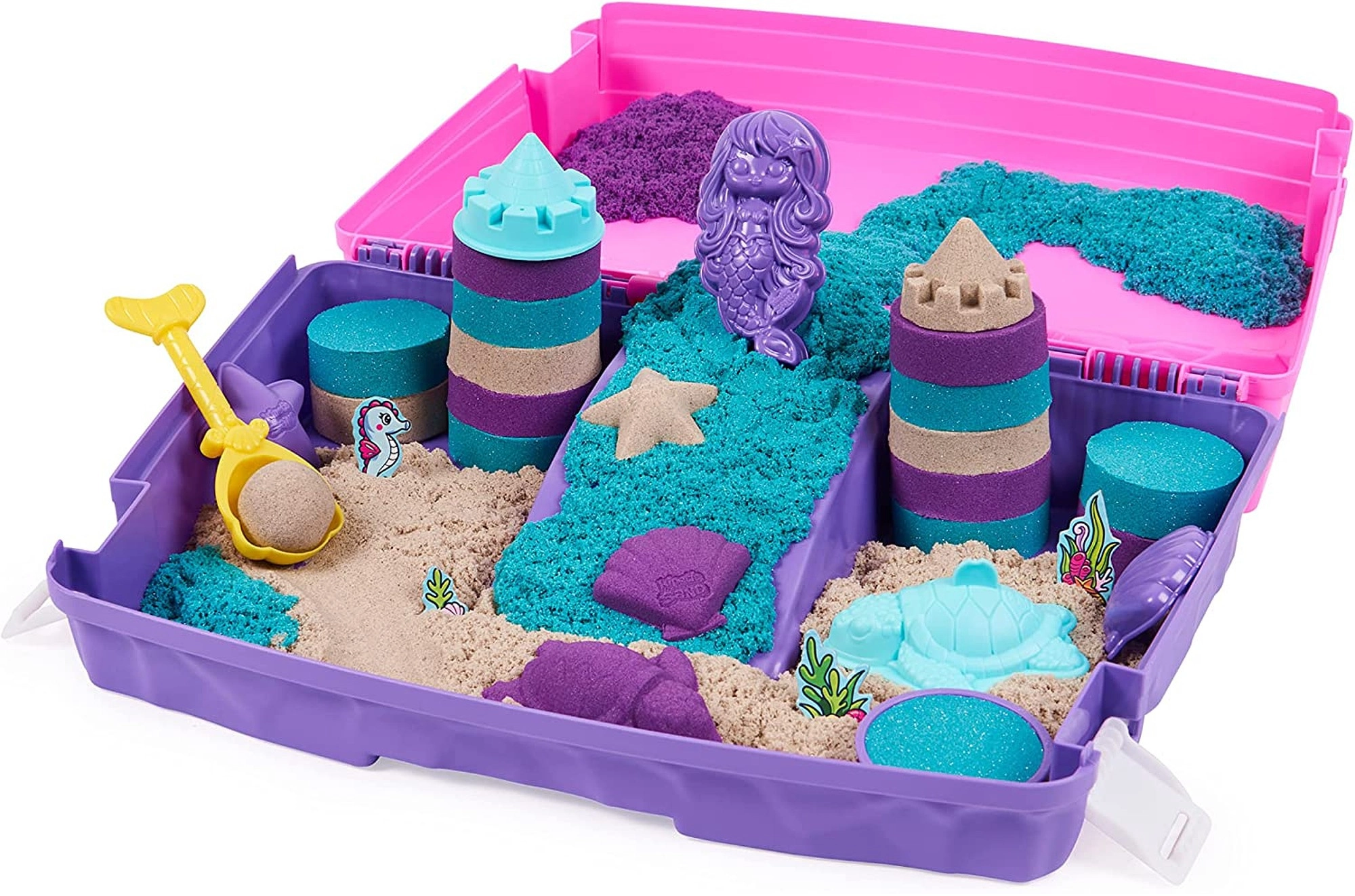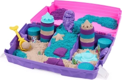 El set Mermaid Palace en un práctico maletín aporta 934 g de arena en 3 colores y una colección de moldes y herramientas para crear un reino marino. La arena contiene un componente natural, es agradablemente moldeable, nunca se seca y fomenta la motricidad fina y la imaginación de los niños. El maletín funciona como bandeja de juego y caja de almacenamiento, ideal para viajar y para jugar ordenadamente en casa.