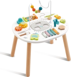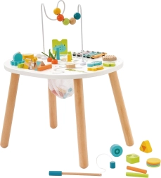 Esta robusta mesa de actividades está hecha de madera de alta calidad y complementada con elementos metálicos, textiles y de fieltro para una experiencia multisensorial variada. Los colores suaves y el diseño amigable fomentan la imaginación y el aprendizaje natural a través del juego. Su estructura estable garantiza un juego seguro para niños a partir de 18 meses.