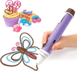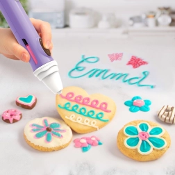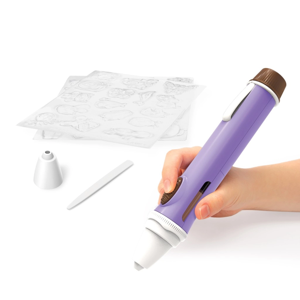 Transforme los dulces en pequeñas obras de arte. El bolígrafo de chocolate permite a los niños escribir, dibujar y crear distintas formas con chocolate derretido. Gracias al agarre ergonómico y a la punta precisa, resulta cómodo incluso para manos pequeñas, y el chocolate de rápido endurecimiento proporciona un efecto inmediato en galletas, cupcakes, fruta y otras delicias.