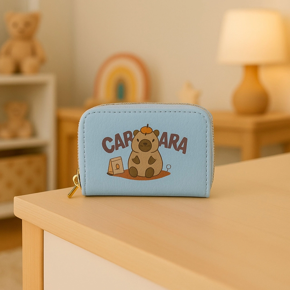 Esta billetera azul claro combina un diseño lúdico con capibara y organización práctica. Dos cremalleras doradas separan el espacio de almacenamiento, para dividir fácilmente tarjetas, efectivo, monedas y recibos. El diseño interior tipo acordeón ofrece una visión rápida y un acceso cómodo.