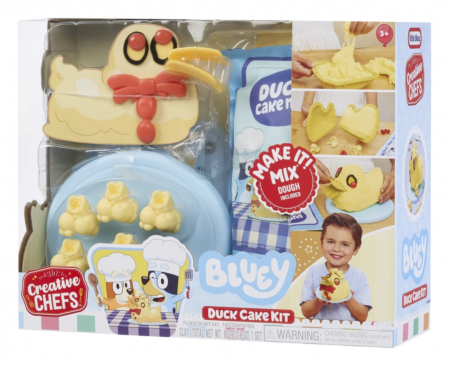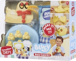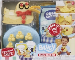 El set CREATIVE CHEFS BLUEY – Pastel “Patito” ofrece horas de diversión y estimula la imaginación de los niños. Incluye 15 accesorios de cocina realistas, un molde con forma de patito y masa moldeable Make It! Mix. También contiene una receta ilustrada que enseña a seguir instrucciones sencillas y fomenta el juego creativo y el role-play.