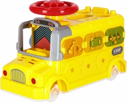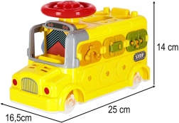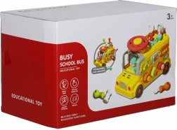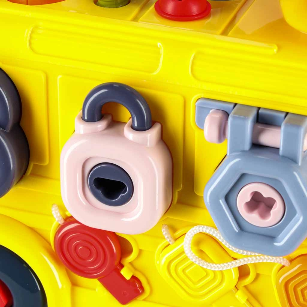 El autobús interactivo combina vehículo y mini taller en uno. Los niños pueden conducir, atornillar, probar cerraduras con llaves, girar el volante y explorar el “motor” bajo el capó abatible. Las variadas tareas desarrollan de forma natural la motricidad fina, la paciencia y la resolución de problemas.